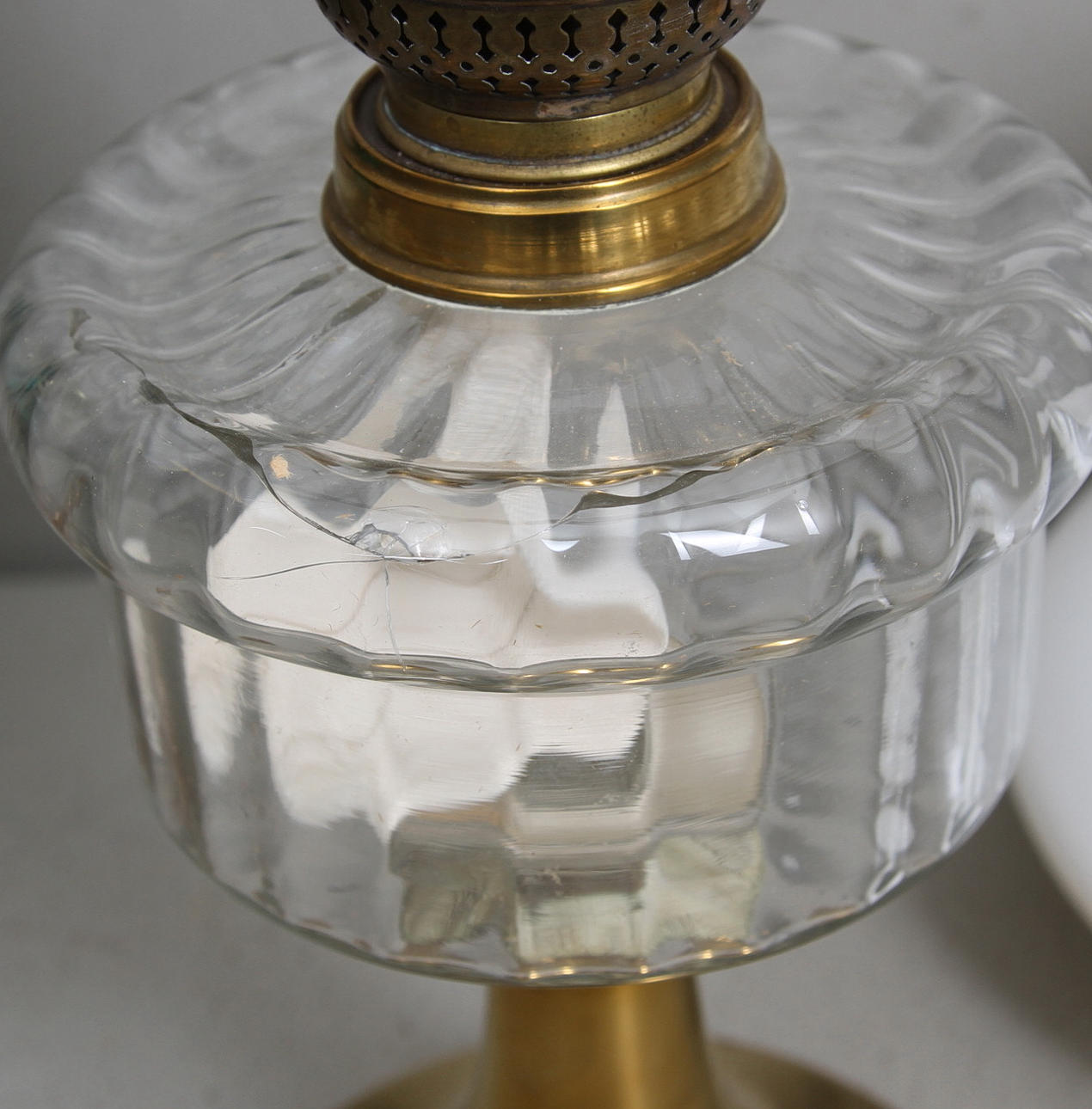 Bruksslitage. Lampa med mässingsfot, lagning samt sprucket oljehus i glas.