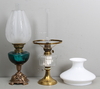 Fot i metall. Oljehus i glas. Delvis frostad glaskupa. Höjd ca 48 cm. Fot i gulmetall, vit glaskupa, höjd ca 40 cm.