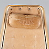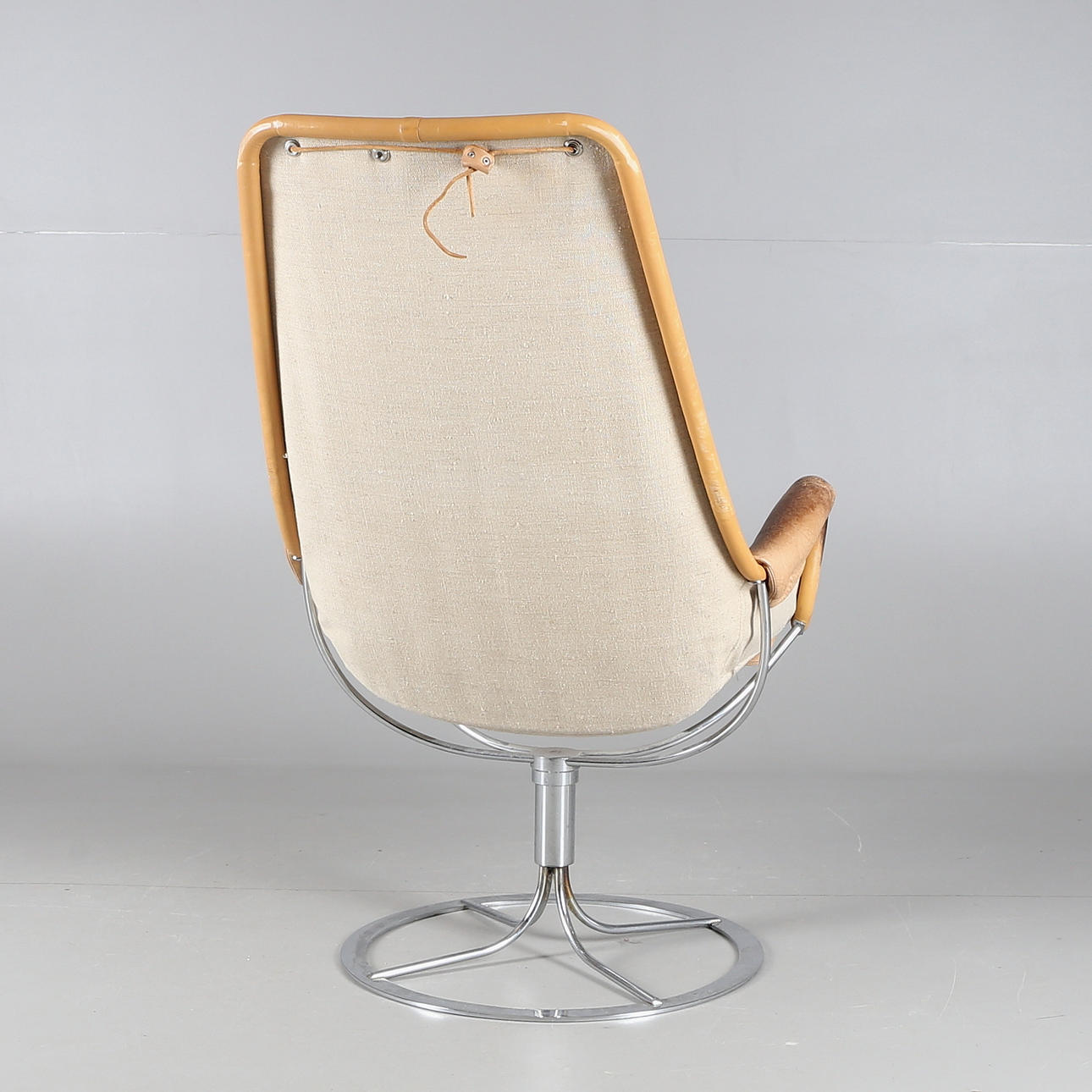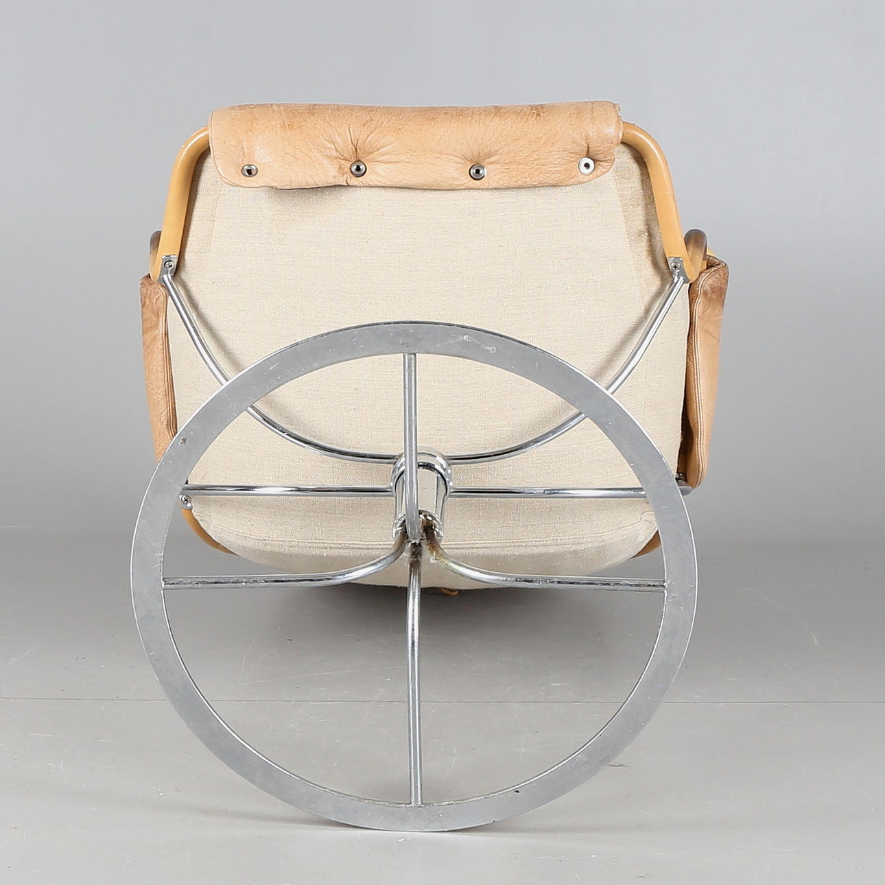 Stomme av kromad metall, sits av kanvas med lös dyna av skinn.