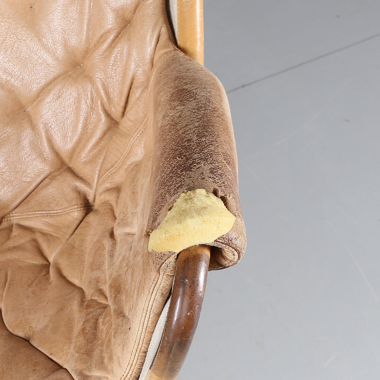 Omfattande slitage. Hål i skinn på armstöd, blekt, fläckar, en (1) knapphållare saknas under sits samt nackkudde (1)samt vid vänster armstöd (1), bruksslitage.
