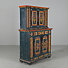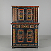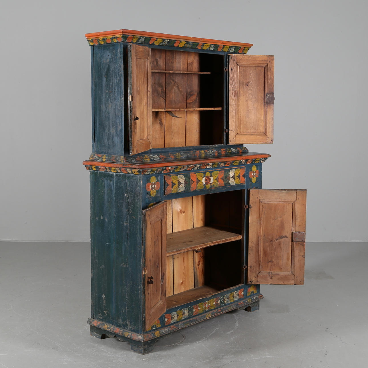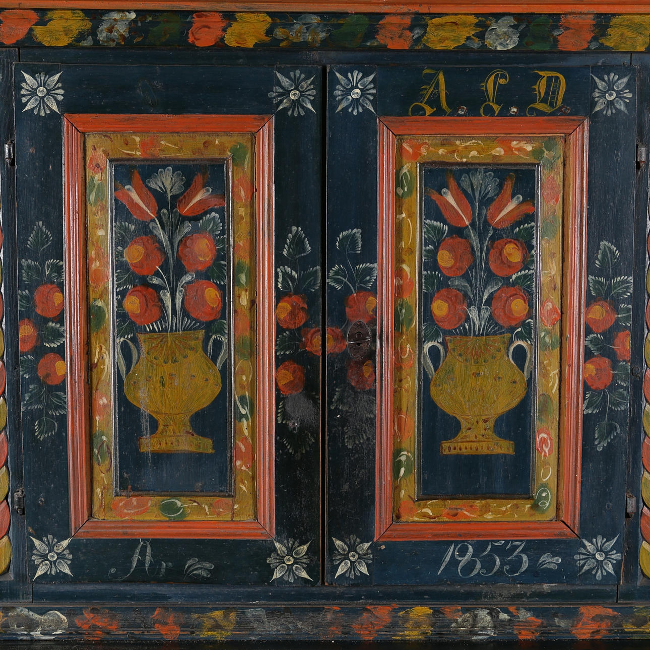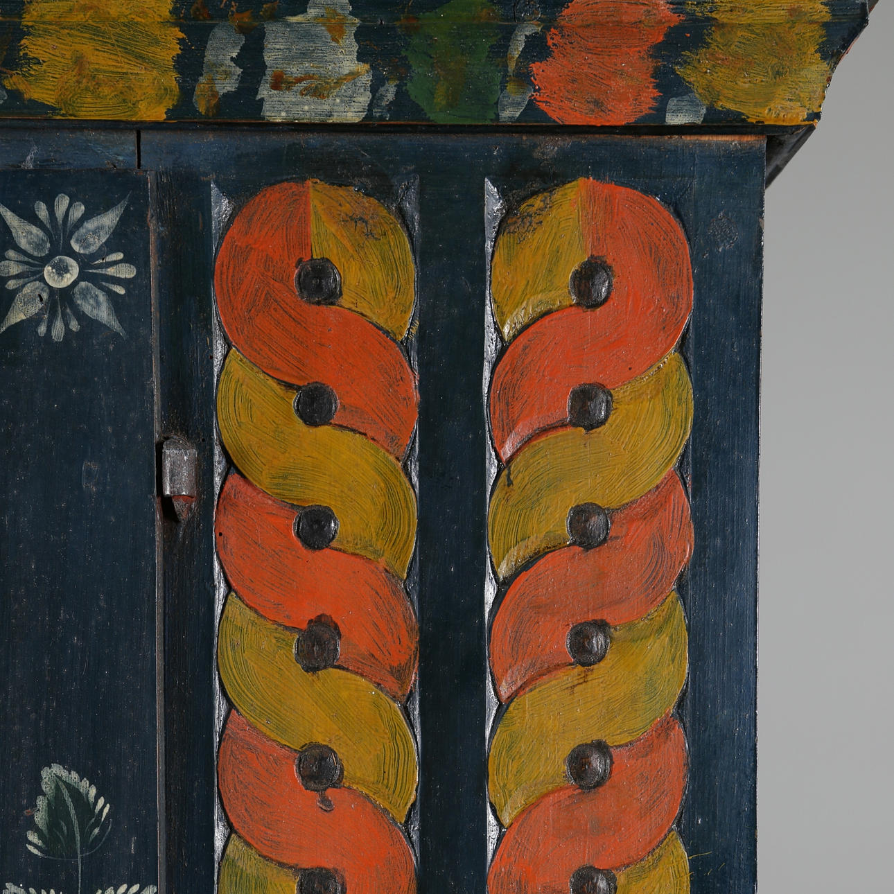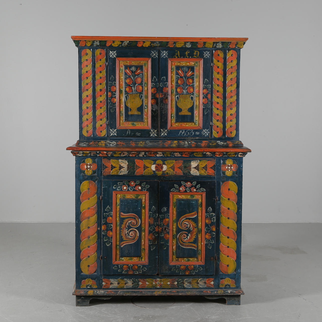 Salskåp i orginalmålning, med skurna bandflätor på sidor och skurna rosetter och blad på undersidor samt bemålade rosenbuketter på dörrar, datering År 1853 och med initialer A L D.
