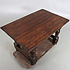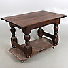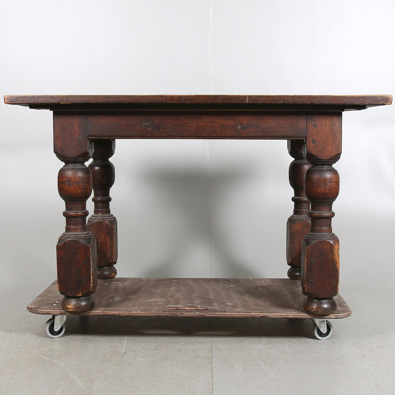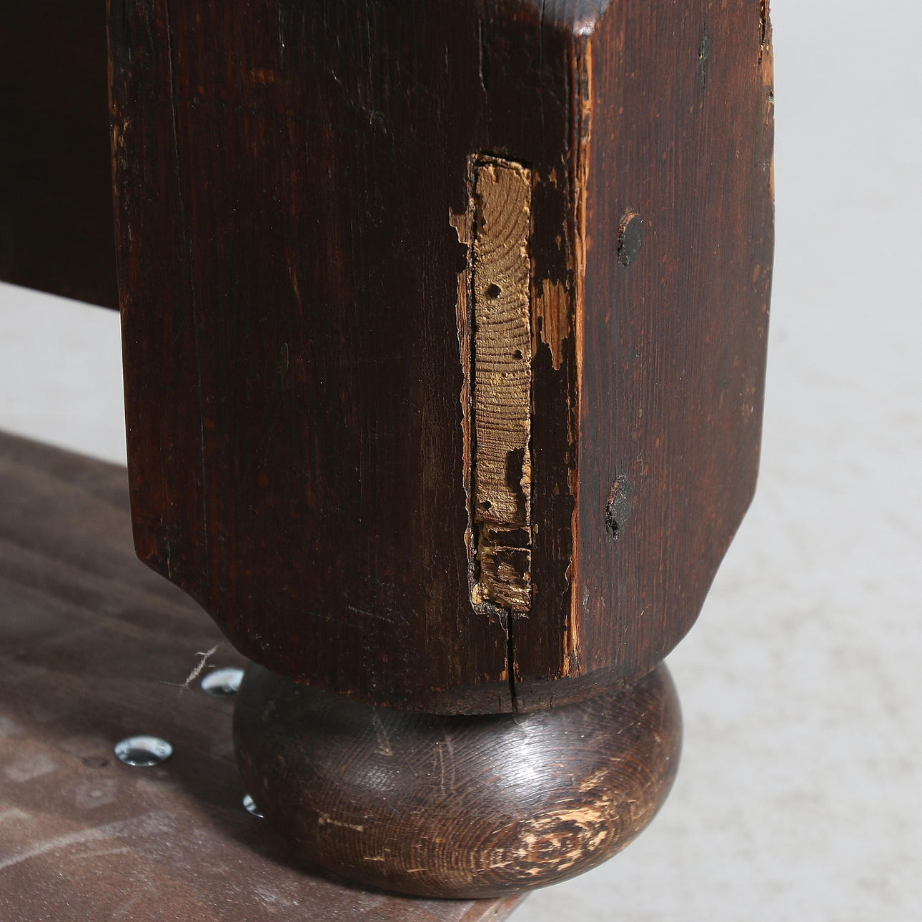 Bruks- och åldersrelaterat slitage, renoverat och kompletterade klot, sprickor, repor, märken. Ett par tvärslår kapade. Hörn på benställning med skada.