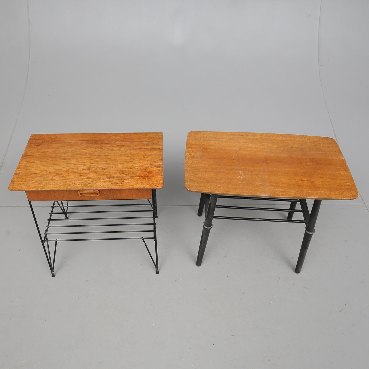 Fanerad med teak. Svärtad benställning av trä respektive metall. Underliggande tidningshylla. Ett bord med låda under skiva. Längd 52-60. Bredd 31-34. Höjd 51-53 cm.