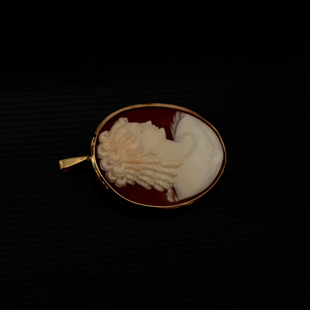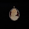 18 karat guld, came. Höjd 34 mm, bredd 28 mm.