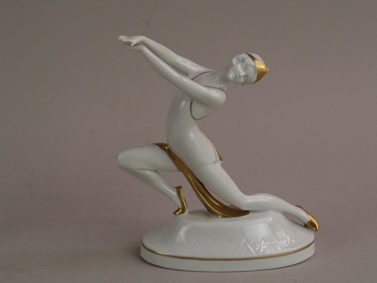Art Deco kvinnliga dansare - nederst märke Gehren, vardera på rund sockel, vitt porslin dekorerat i guld, höjd ca 23 och 19 cm.