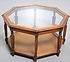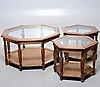 Tre st med glasskiva och rotting. Höjd 54 cm, diameter 70 cm och 104 cm.