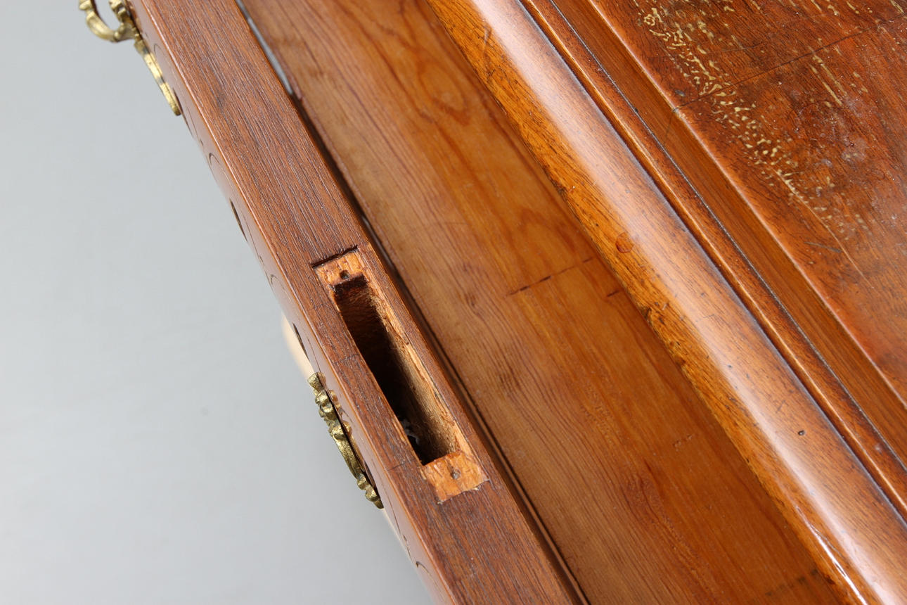 Valnöt Nyrennässans. Med lampetter och beslag i gjuten mässing. Längd 106, bredd 56, höjd 203 cm.