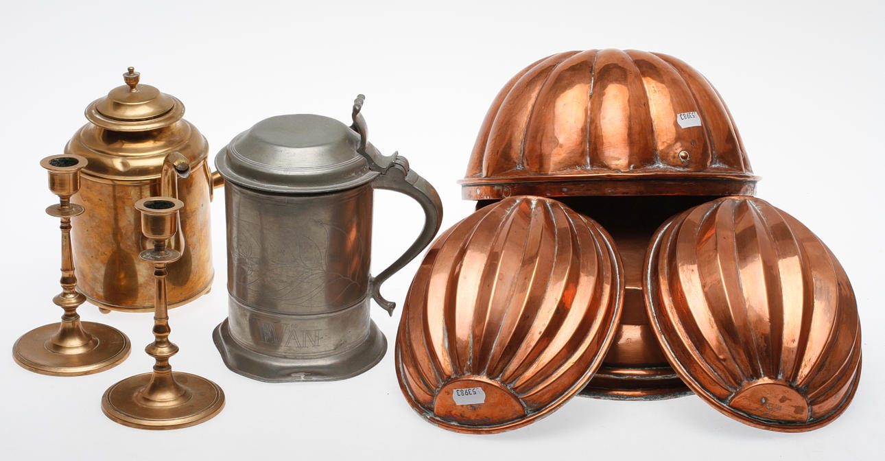 53983. TENN, KOPPAR och MÄSSINGSFÖREMÅL, 9 delar.