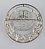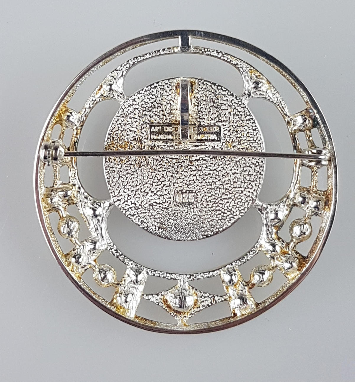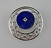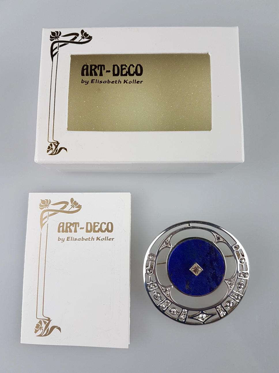 brosch - brosch i art déco-stil, design: Elisabeth Keller, silverstämplad 925, diameter ca 5 cm, prydnad med lapis och strass, stämplad ”Art Deco Handmade E.Keller Austria”, vikt.ca 22,6 g, i orig-kista med certifikat.