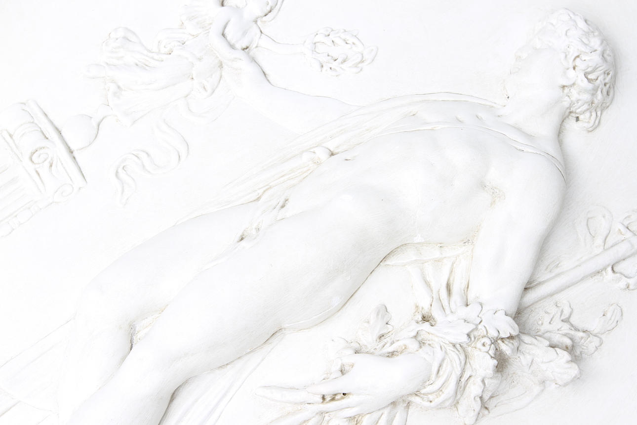 Oval form, gips.Klassicerande motiv. 85X68 cm.