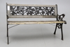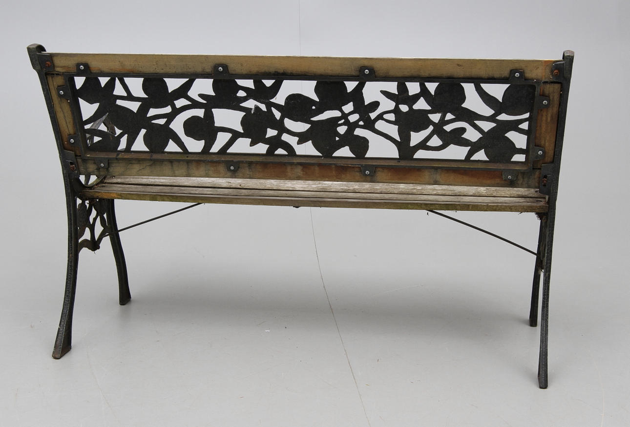 Gavlar och genombruten ryggtavla i metall, sits av trä. Längd 114 cm.