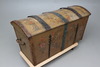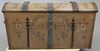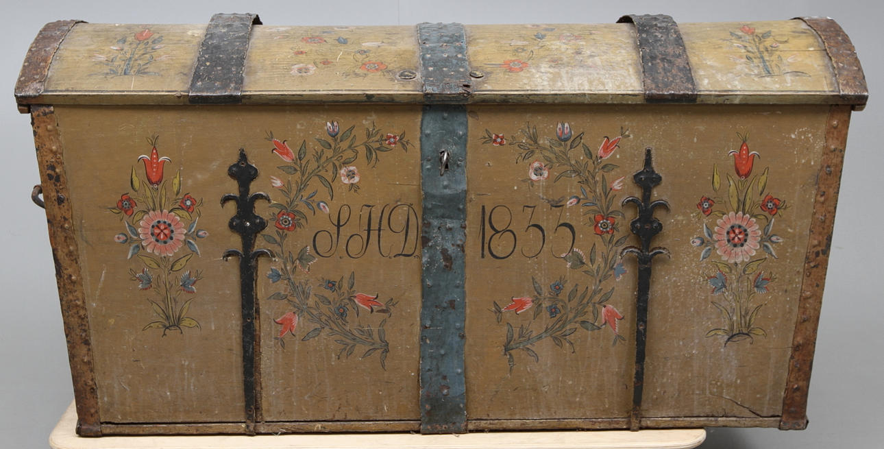Välvt lock, beslag och handtag i järn, dekormålad med blommor mot olivfärgad botten, monogram SHD. Längd 147, bredd 67, höjd 75 cm.