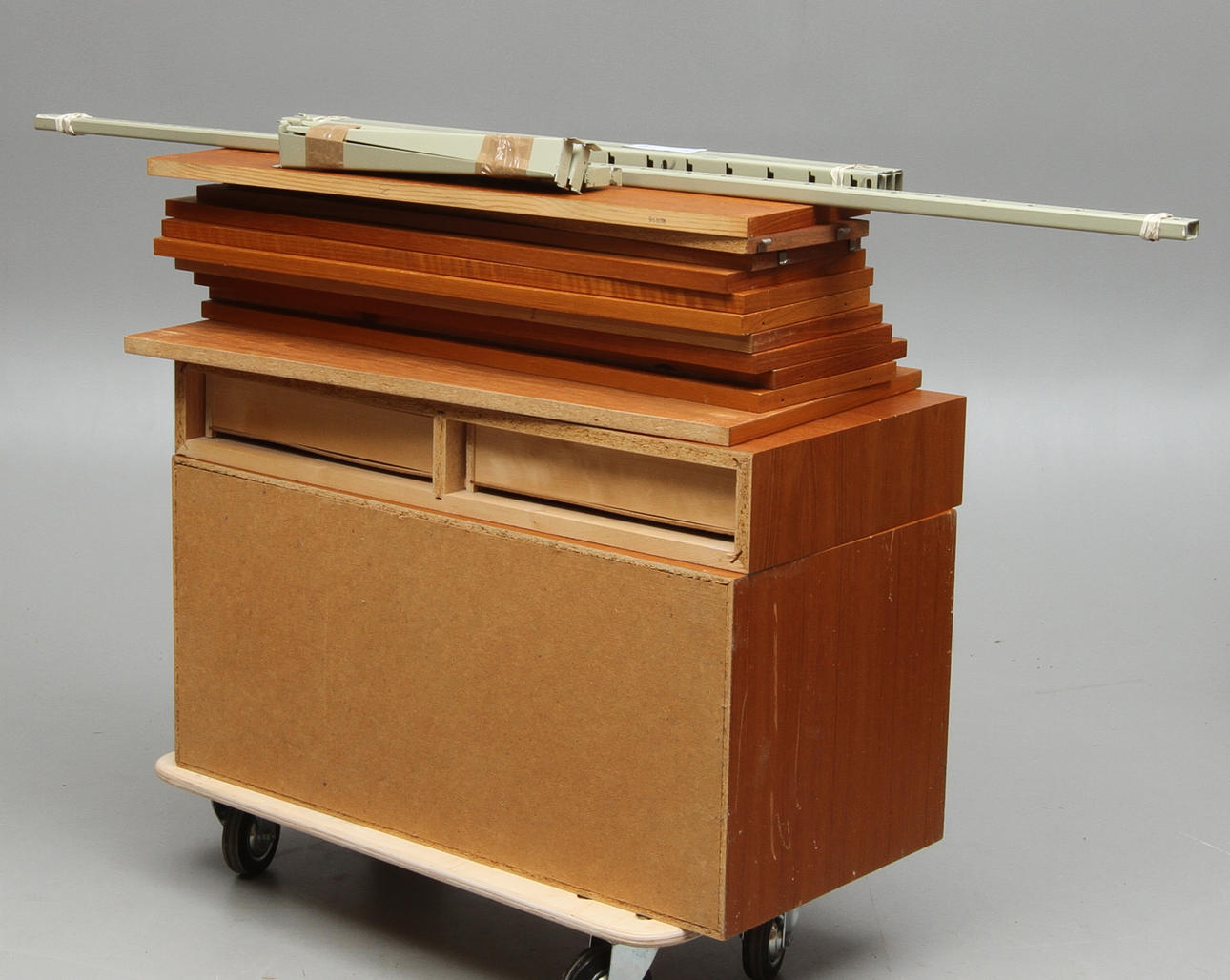 2 konsoler, 11 hyllplan i varierande bredd, hyllplanens längd 80 cm.