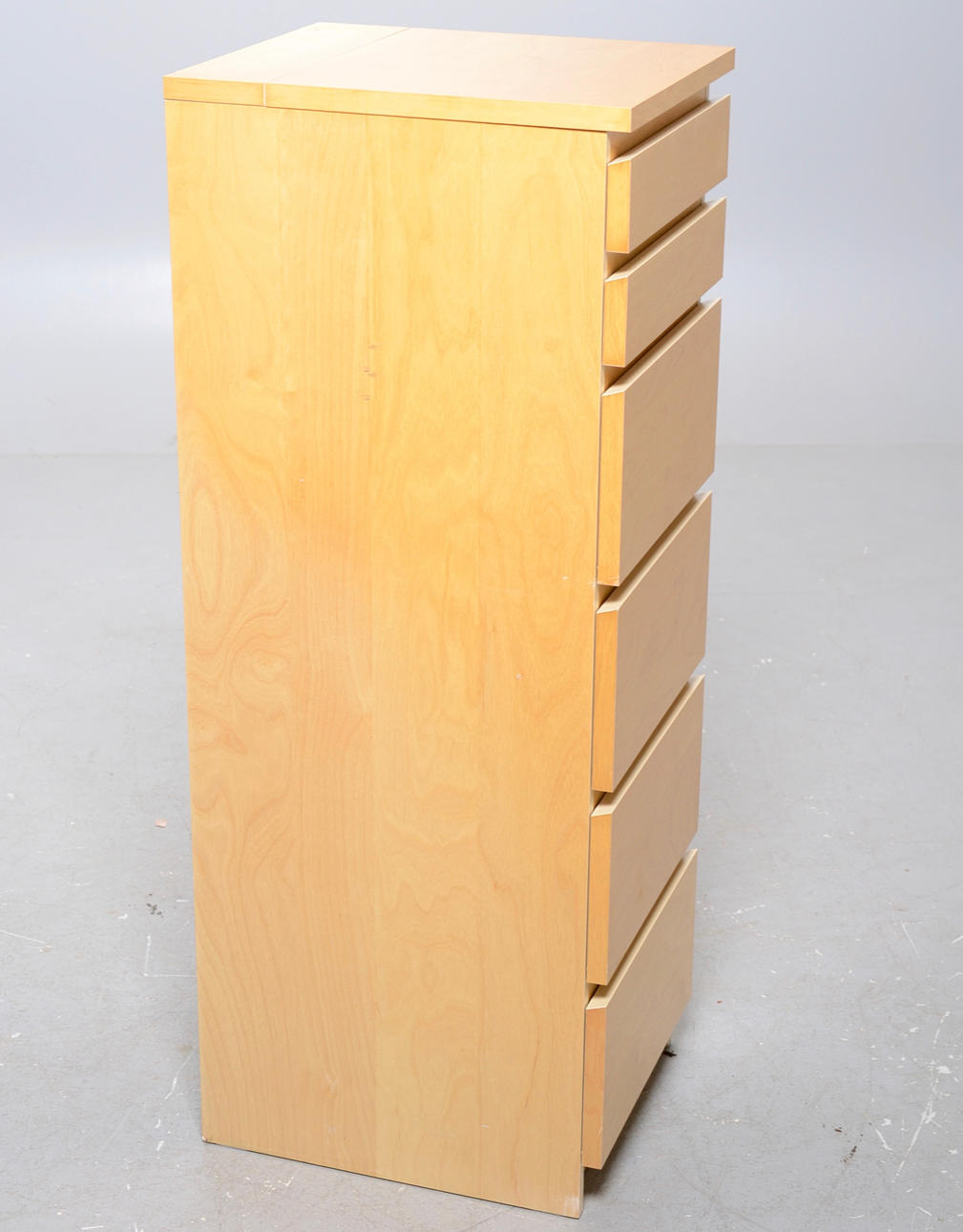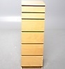 Bonad. Sex lådor. Höjd 122 cm, bredd 40 cm, djup 48 cm.