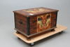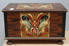 Kvadratisk form med plant lock, kurbitsmålad dekor, beslag av järn. Längd 78, bredd 50, höjd 47 cm.