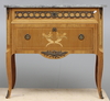 Fanerad i jakaranda m.fl träslag, intarsia med horn, beslag och dekorelement i mässing, stenskiva. Längd 80, bredd 44, höjd 75 cm.