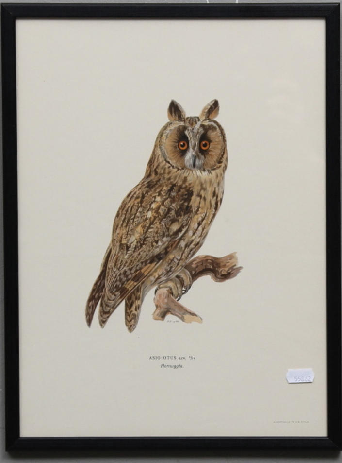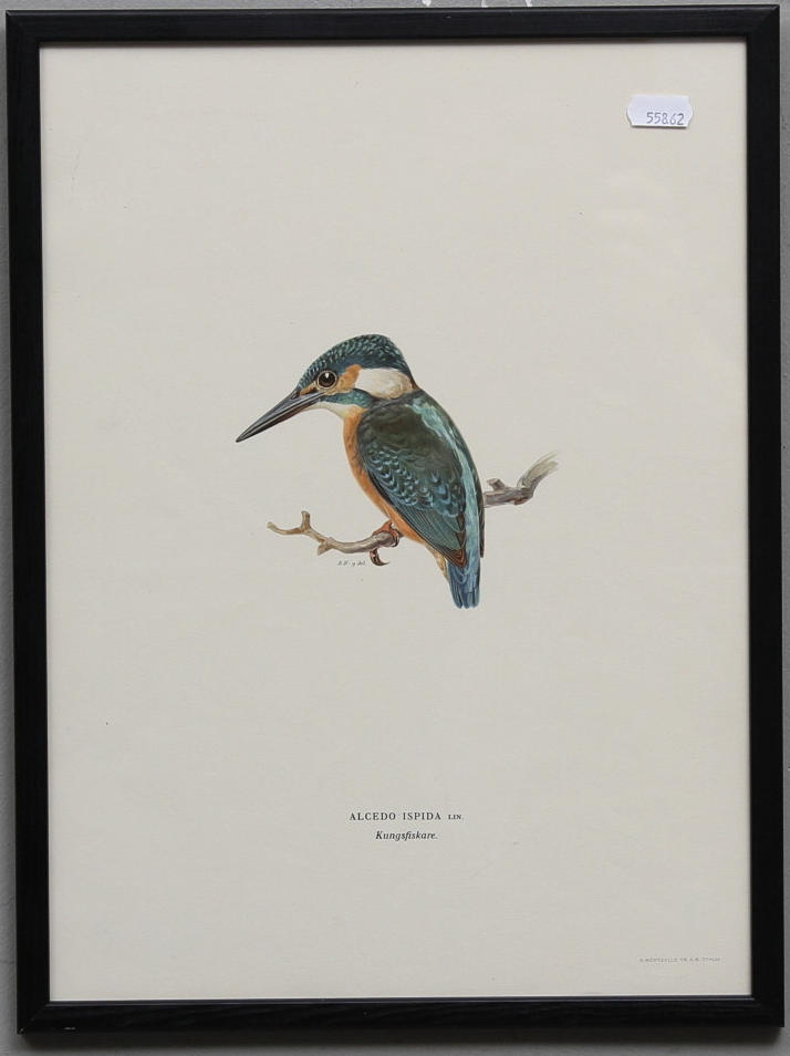 Motiv med kungsfiskare, hornuggla och större hackspett. Bladets totala storlek 30 x 40 cm.