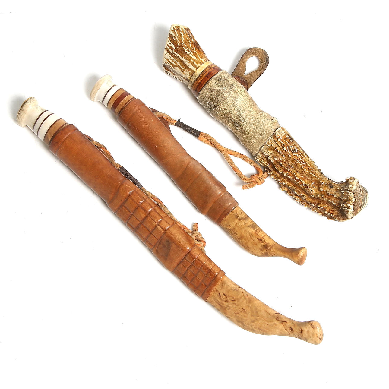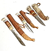 2 st. signerade HF -80, skaft i horn och trä, slidor i läder samt trä, en i horn, längd 9- 15 cm, totallängd med slida 20 - 30 cm.