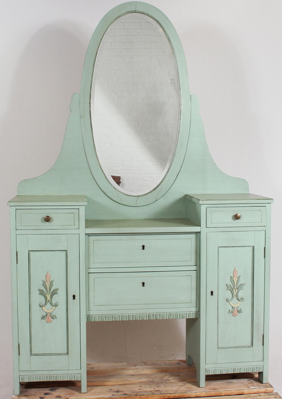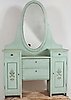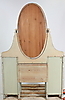 Sminkbord i mestadels ek med fasettslipad spegel, höjd 186, bredd 120, djup 40 cm.