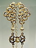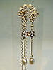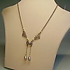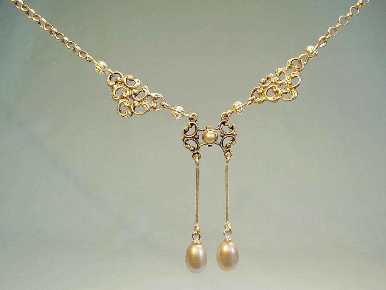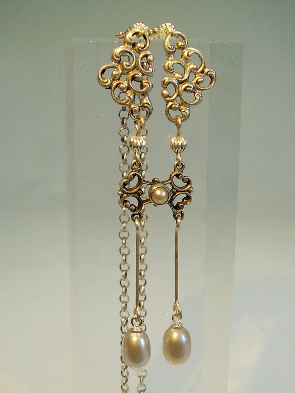 Halsbandet är tillverkat och stämplat i 835 silver, endast spännet har kompletterats och är tillverkat av 925 silver. Mittsektionen är gjord av 7 stycken och bearbetas med en grå halvpärla samt rörliga grå odlade pärlor i en elegant droppform på staplarna. Länkarna är gjorda i öppen rocailleform och avbryts av öljetterade ribbbollar. Halsbandet stängs och öppnas med ärtkedjor med fjäderringlås.