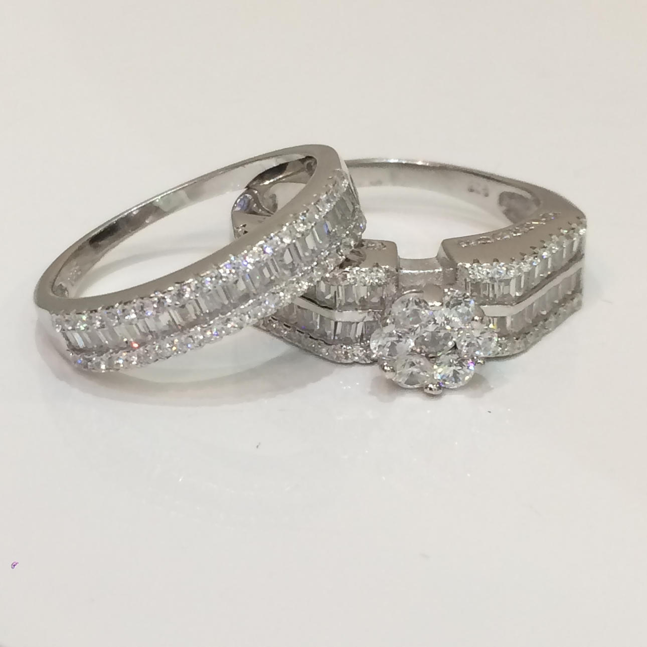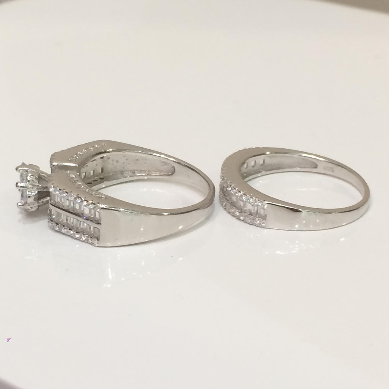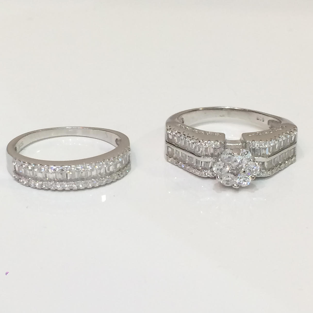 Bröllopet bandet är halv set med en enda rad baguette cut cubic zirconia stenar, vardera sidan är en rad runda briljantskurna cubic zirconia stenar.