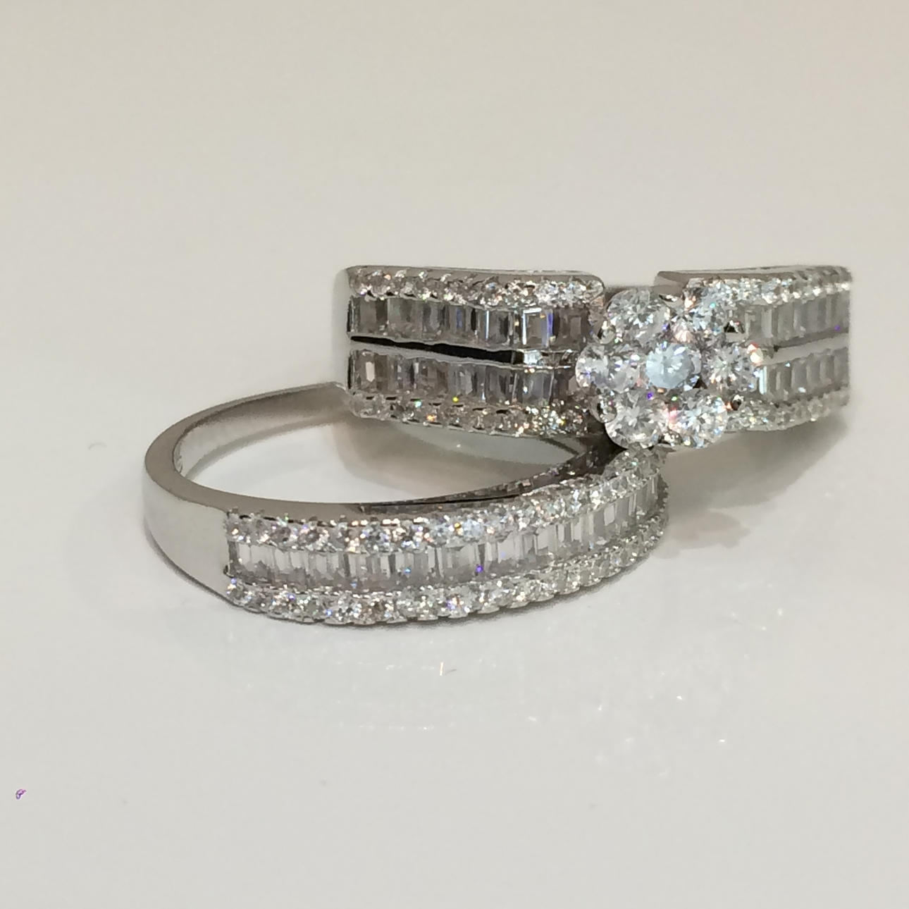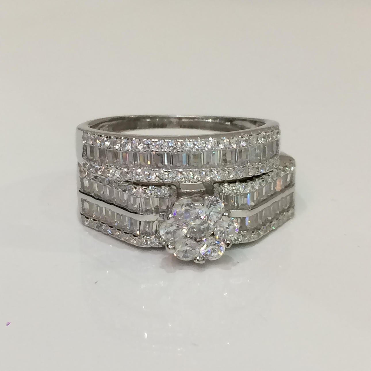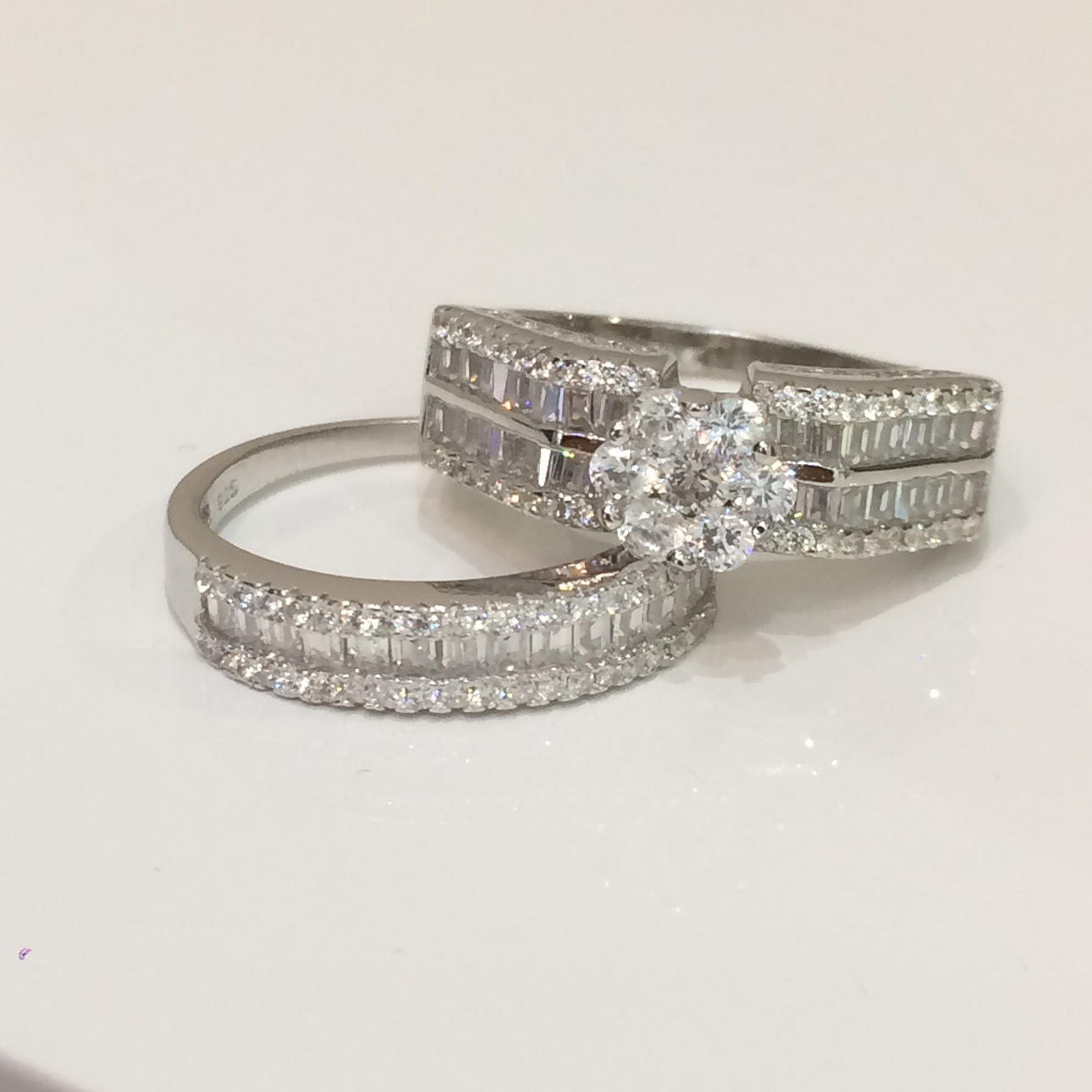 Bröllopet bandet är halv set med en enda rad baguette cut cubic zirconia stenar, vardera sidan är en rad runda briljantskurna cubic zirconia stenar.