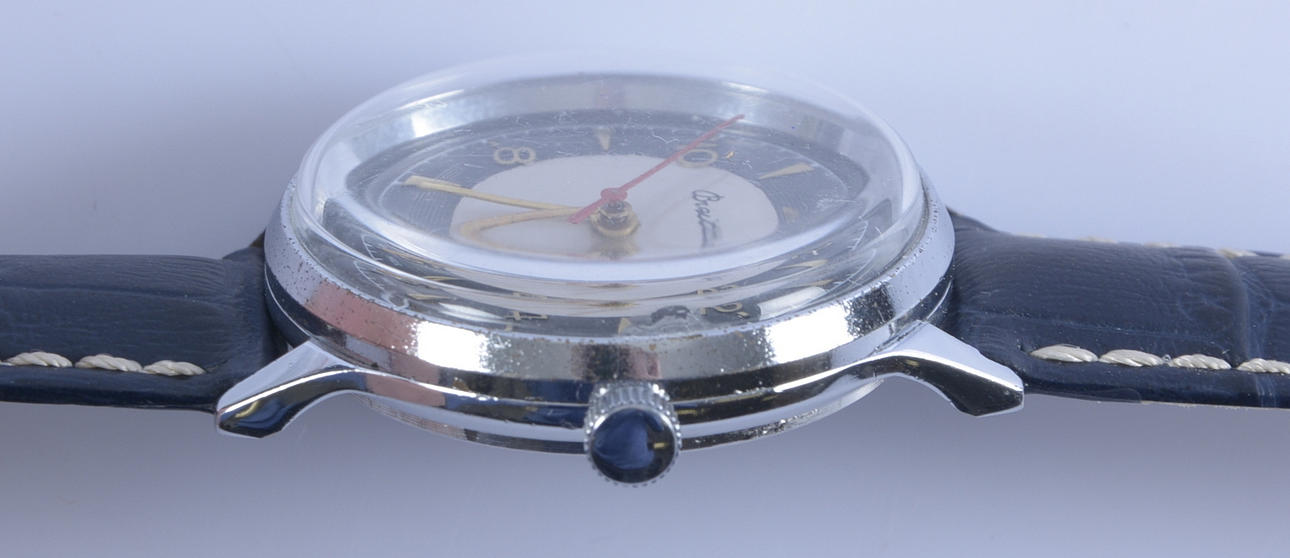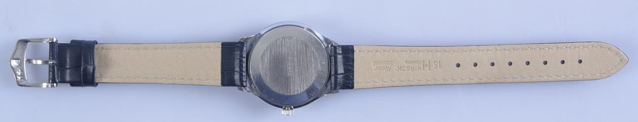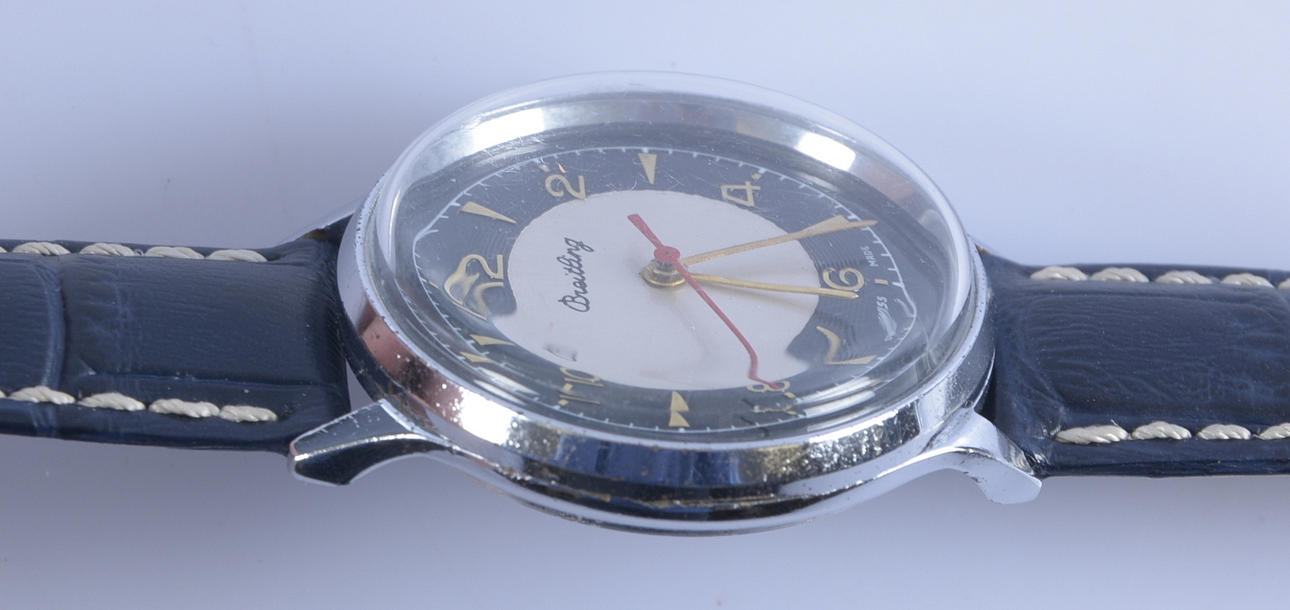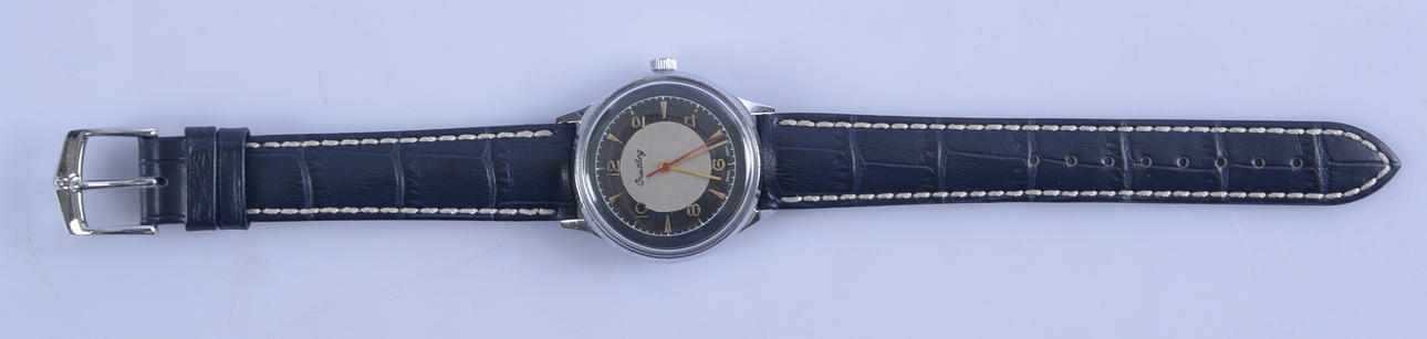 Manuell, boett i vitmetall med baklock i stål, verket samt boetten märkt Breitling, zontavla med centrumsekund, diameter 36 mm. Nytt läderband Hirsch.