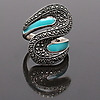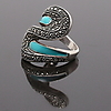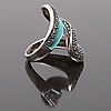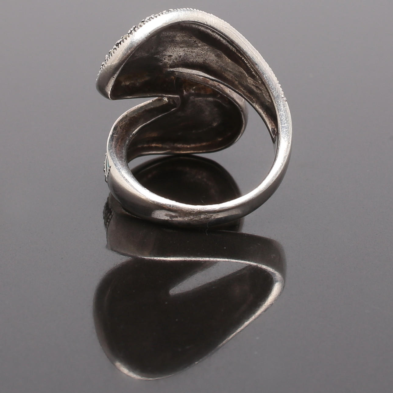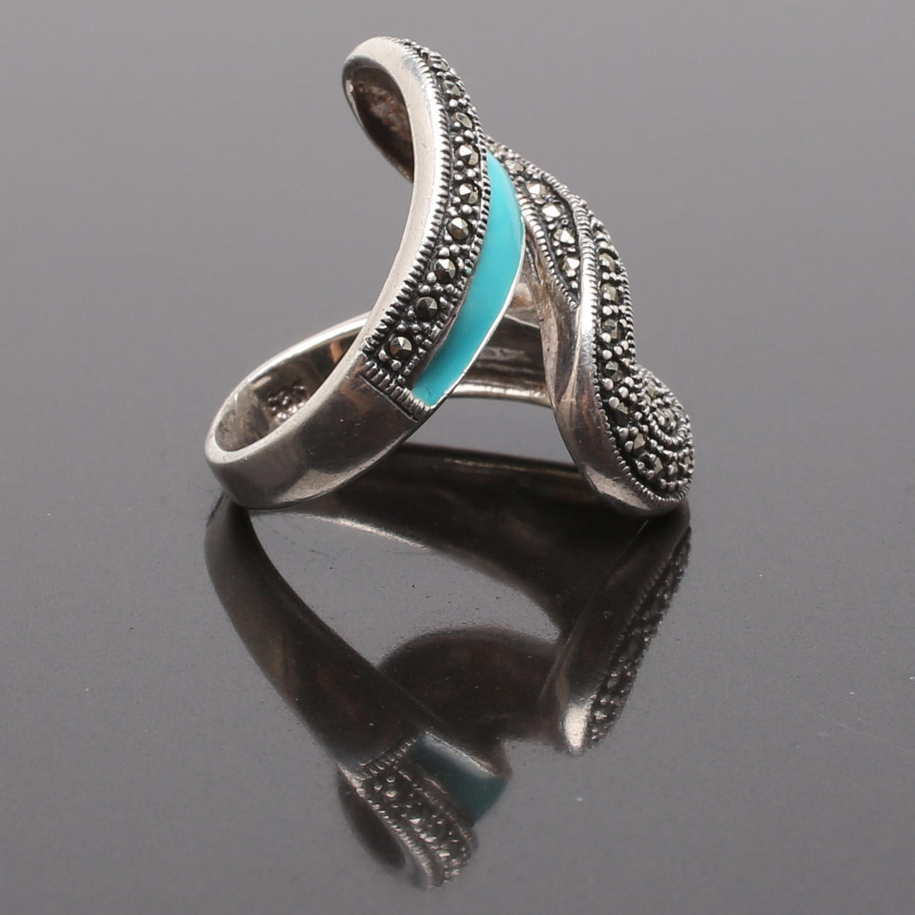 Ring i asymmetrisk form med inläggningar i konstmaterial. Silverhaltsstämpel 925. Storlek 17/54, vikt 10,5 g.