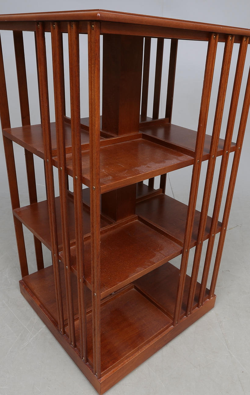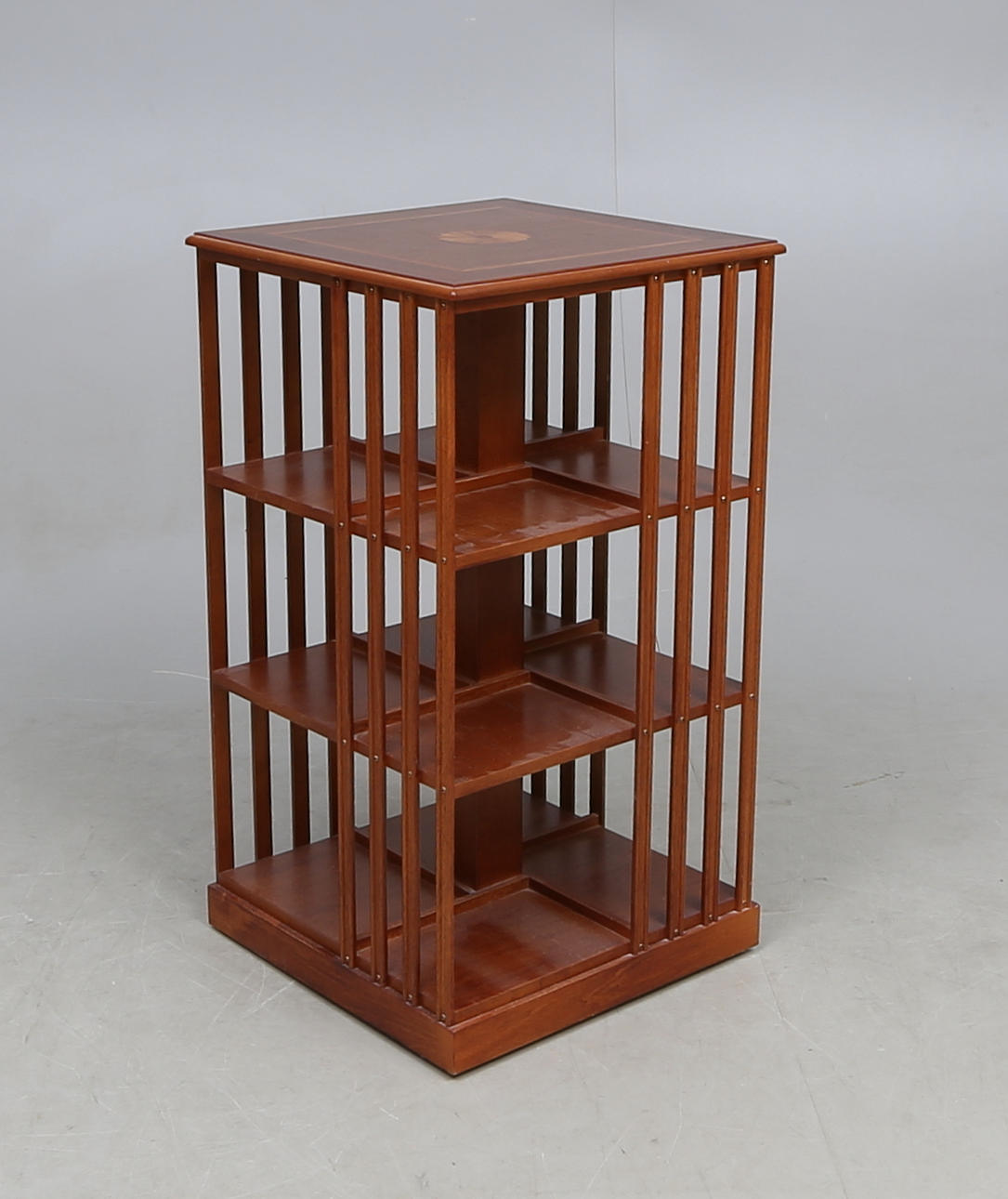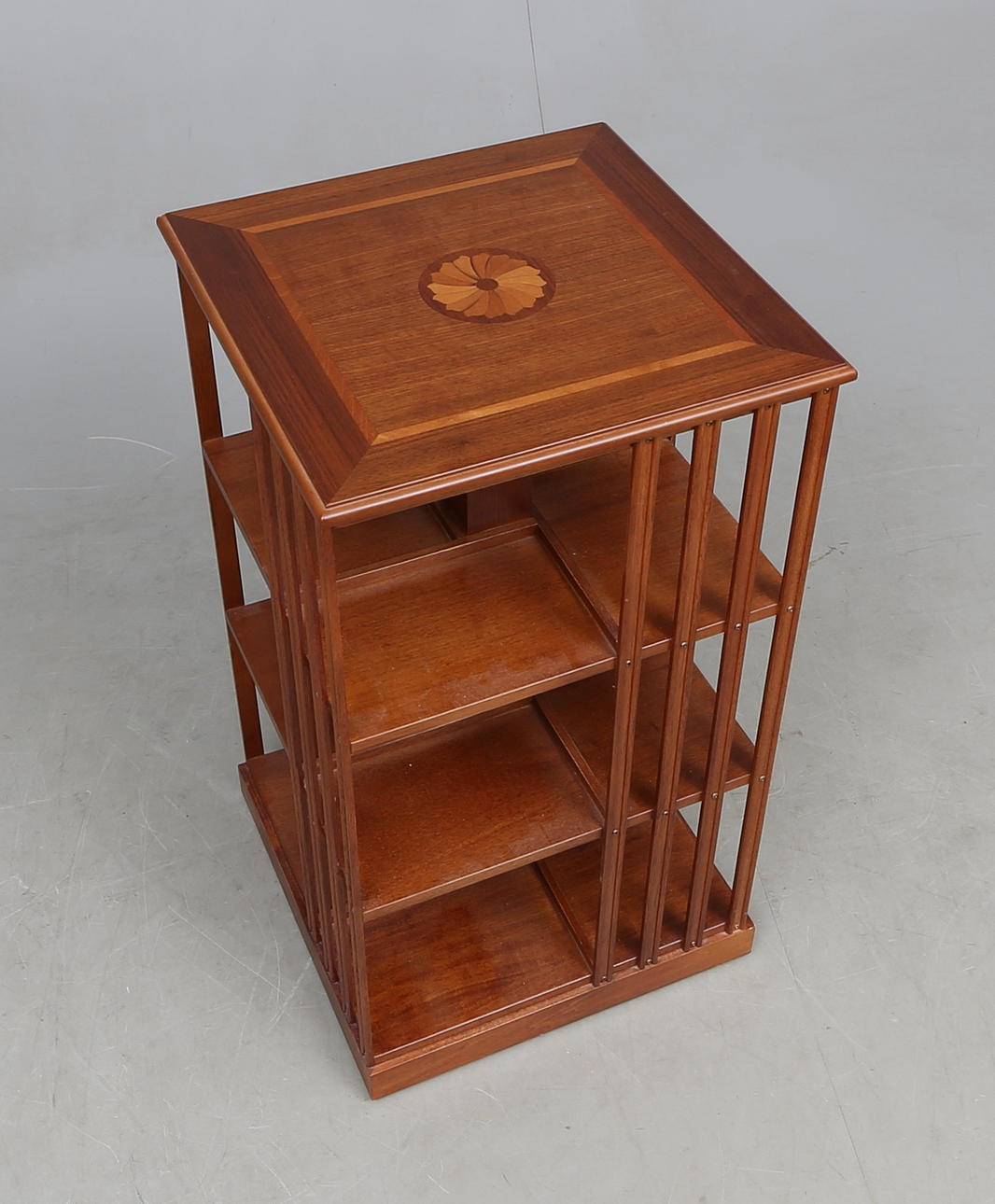 Mahogny med intarsiadekor, ca. 42x42, höjd 76 cm.