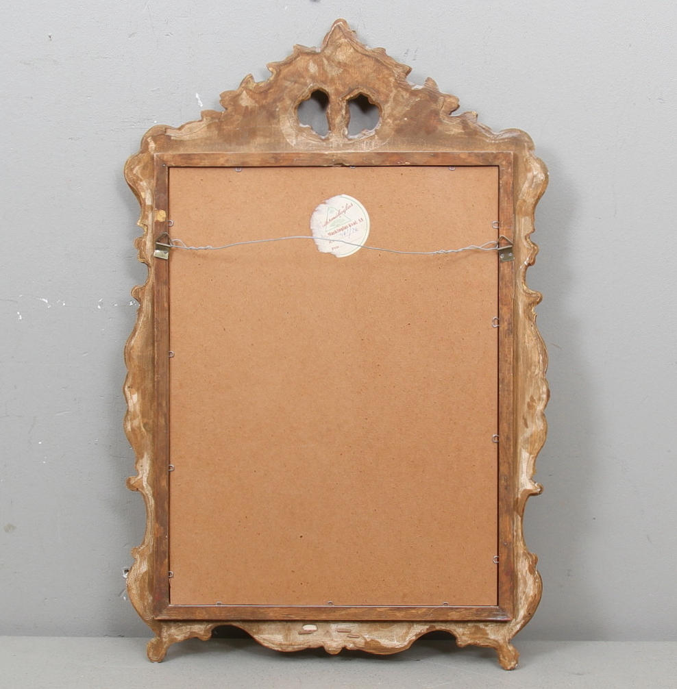 Bruksslitage. Största förgyllda ramen med spricka. Spegel med färgbortfall.