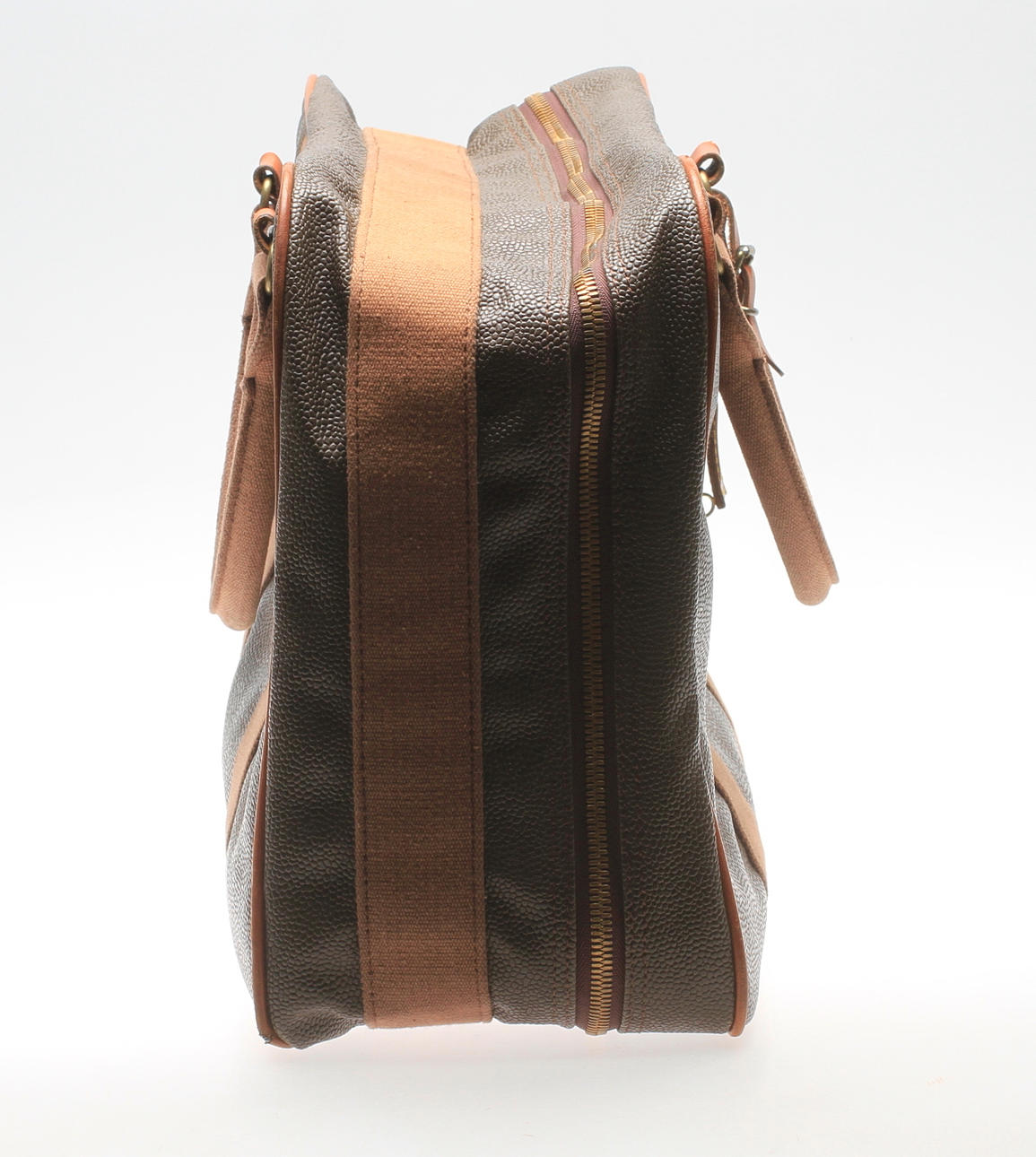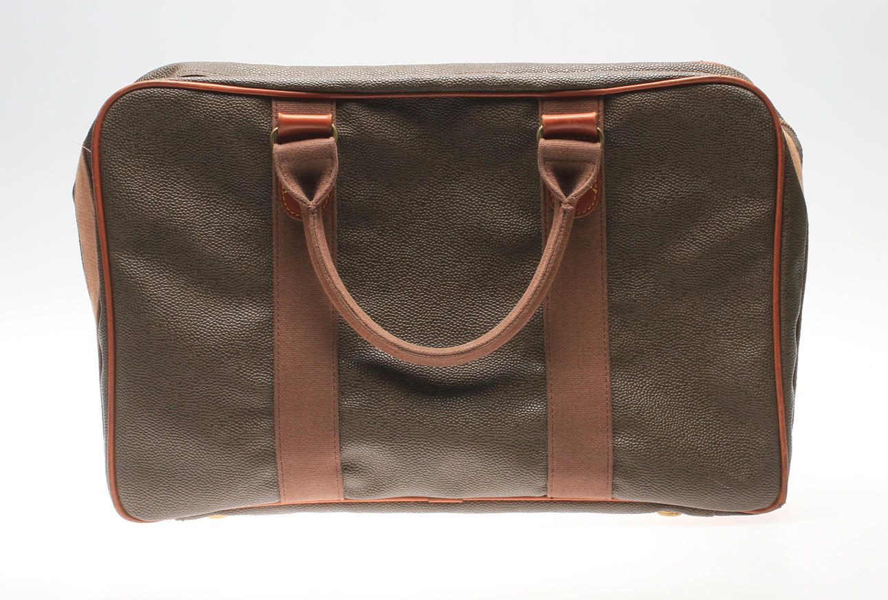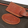Grön schotchgraincanvas, detaljer i tyg, mässing samt läder med logomärkning.