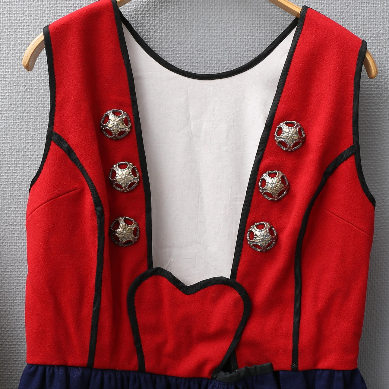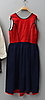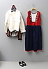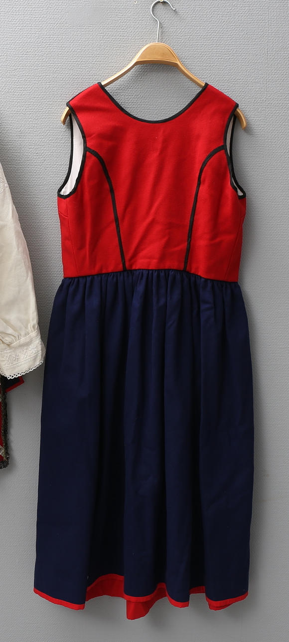 Dräkt längd från axel till kjolslut ca 121, omkrets midja ca 88 cm. 6 knappar av silver.