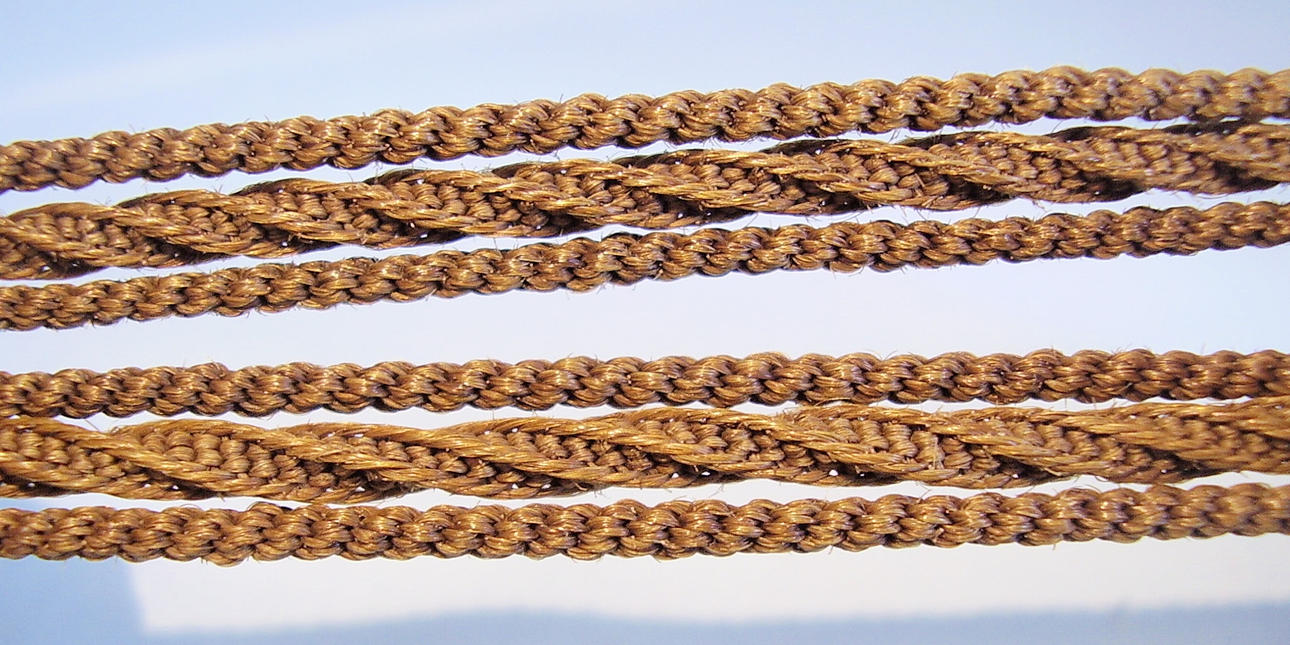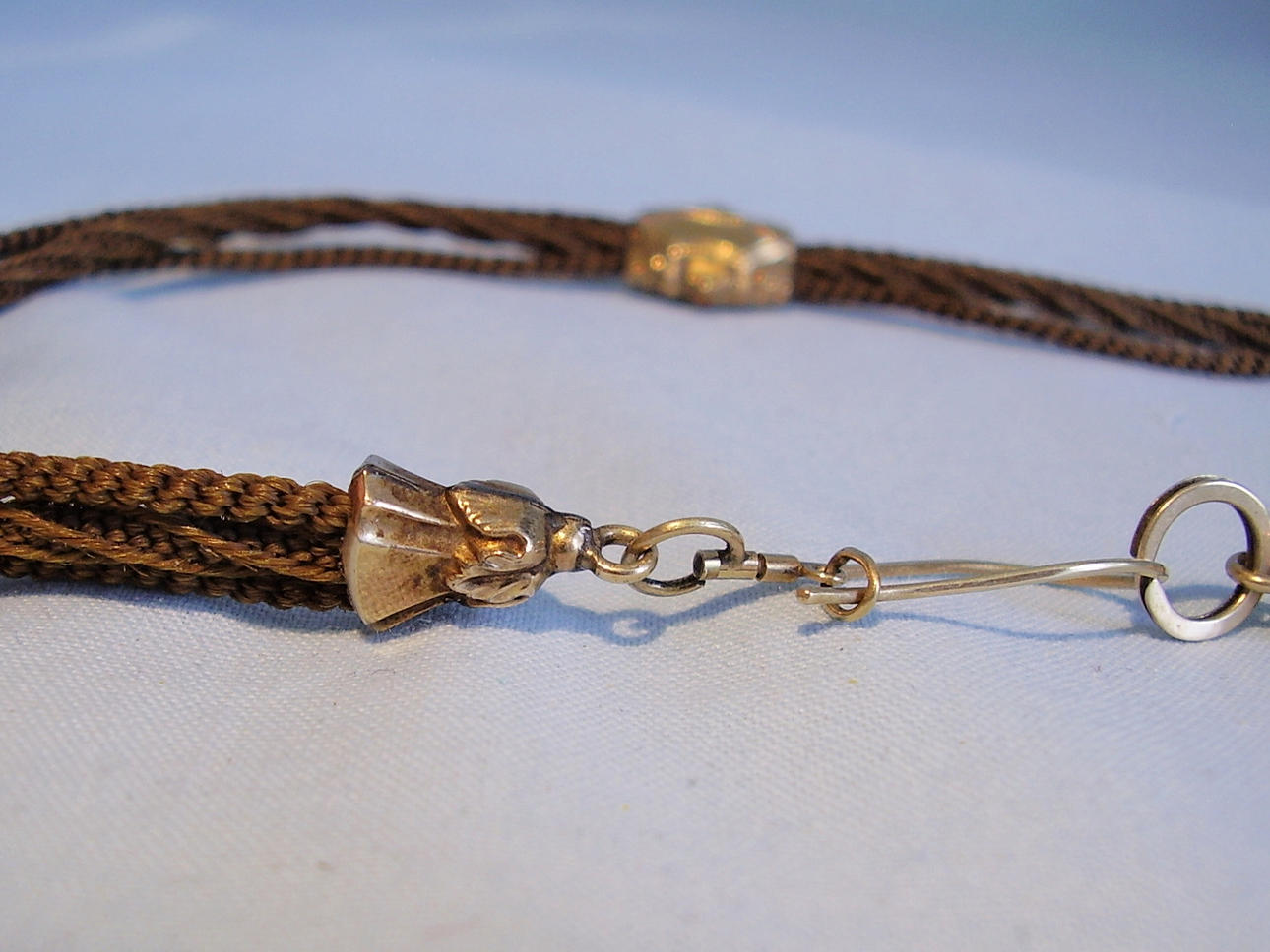 Kedjan är gjord av mellanblont damhår (Friesland) som en 3-radig klockkedja flätad i olika mönster. Ändarna är tillverkade i 585 = 14 karat roséguld och har också professionellt och noggrant kontrollerats av mästarguldsmeden. Ändarna är dekorerade mössor med akantusblad, mittsektionen är strukturerad och ogravad. Kedjan är stängd av en krok stängning med aretting ögla.
