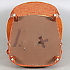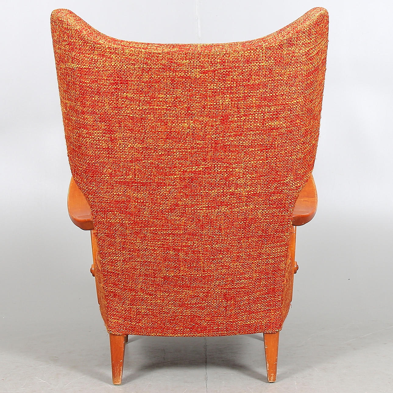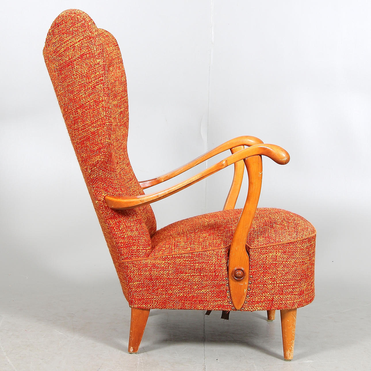 Stoppad sits och rygg klädd i orangerött tyg med djuphäftad rygg. Stomme i björk med svängda armlän.