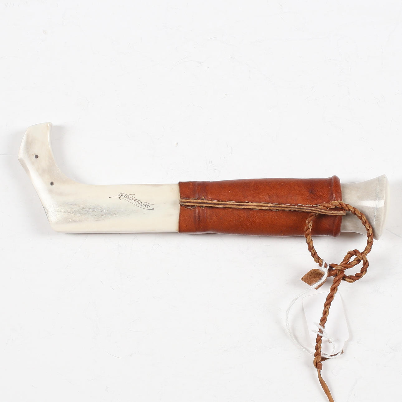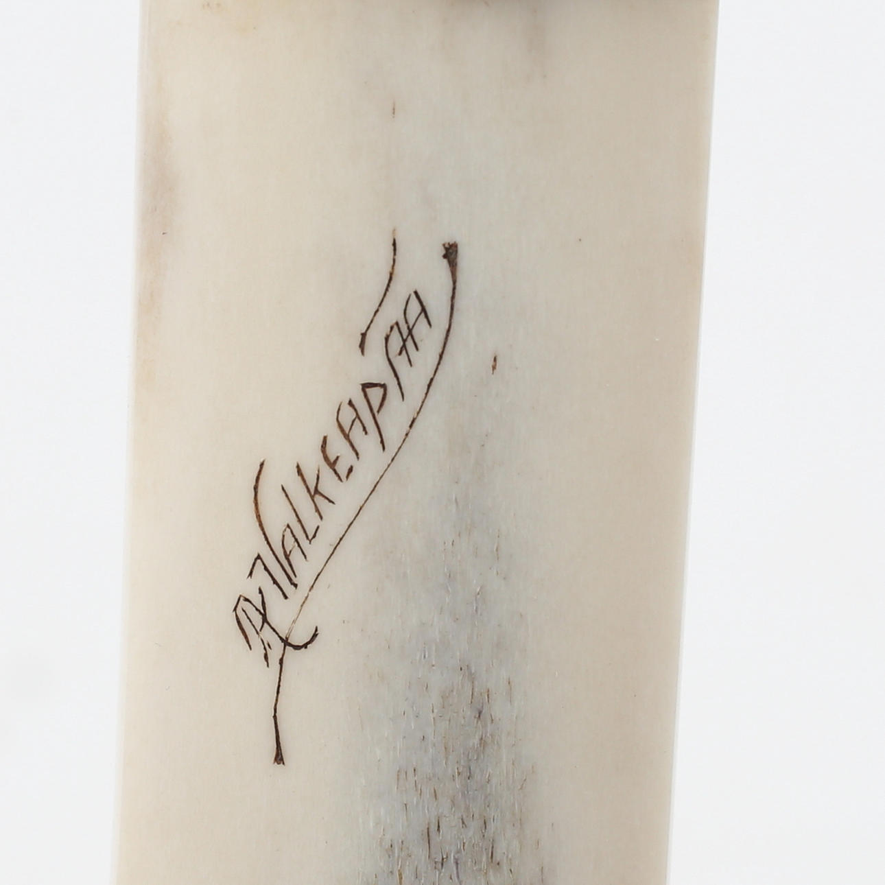 Graverat arbete i renhorn, signerat A. Valkeapää på slida.