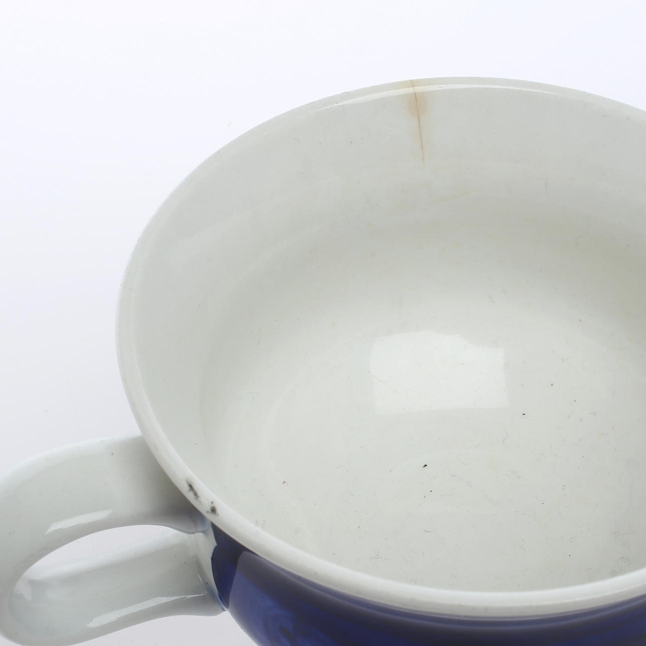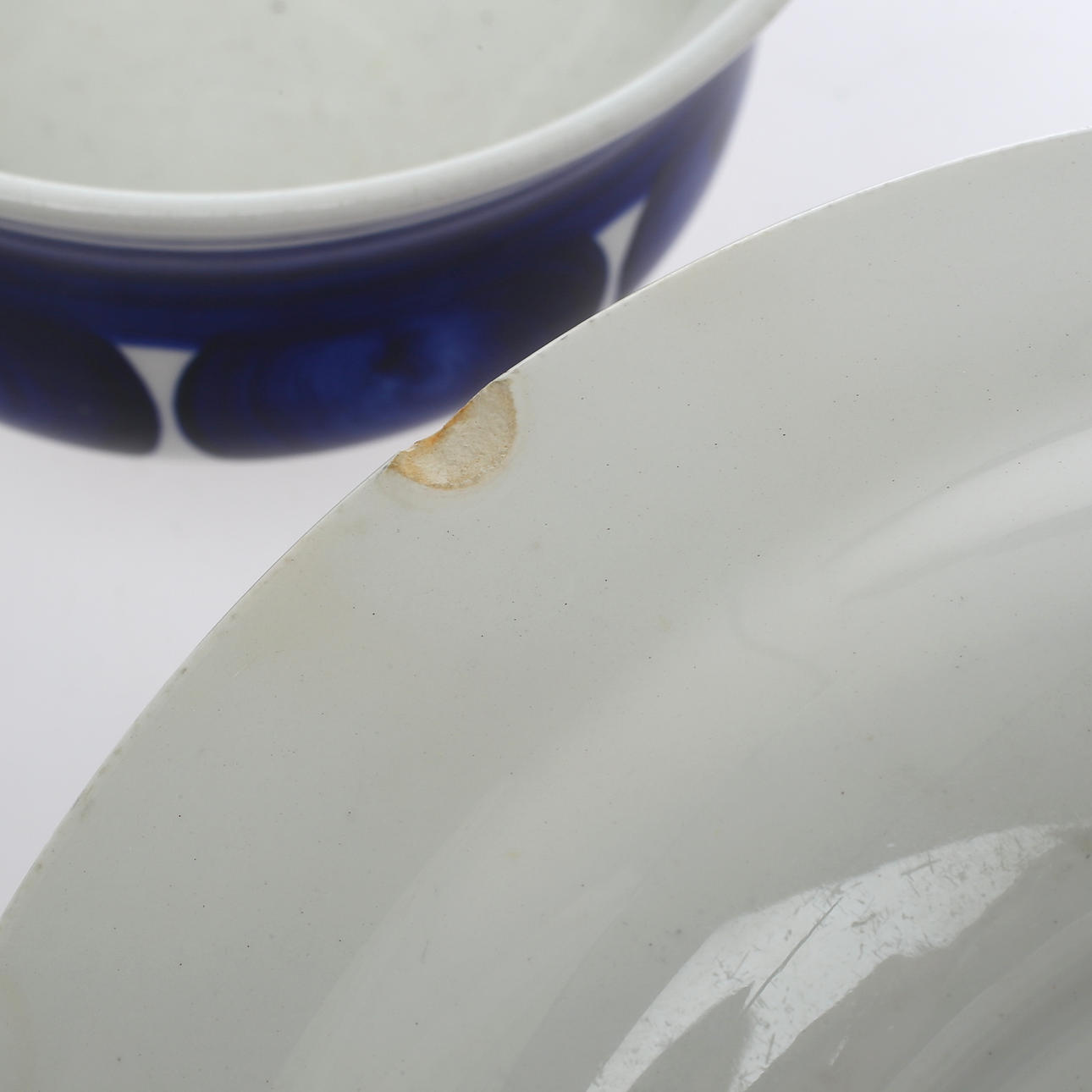 Bruksslitage, nagg, tillverkningsdefekter, samt spricka i en av kopparna.