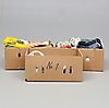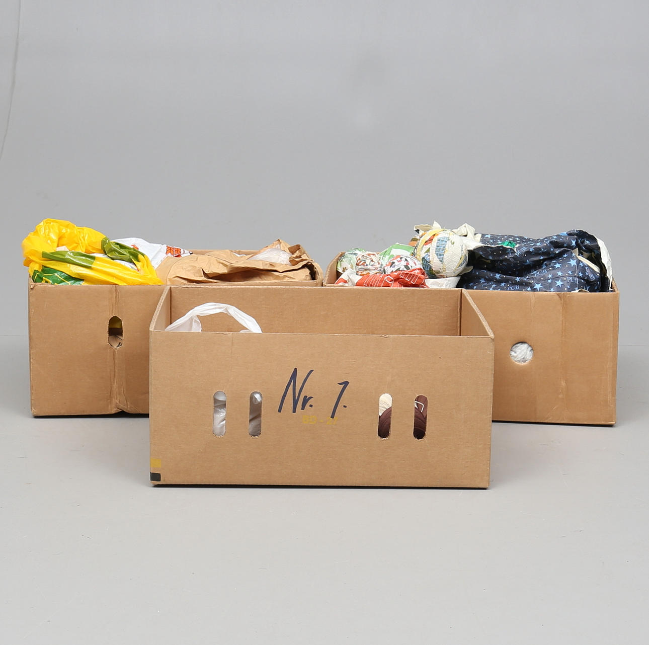 Enligt uppgift: Två varpflätor samt mattvarp ca 3,5 kg. Tvättade och klippta bomullstrasor. Två vävskyttlar samt två hållare. Åtta vävböcker.