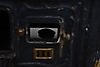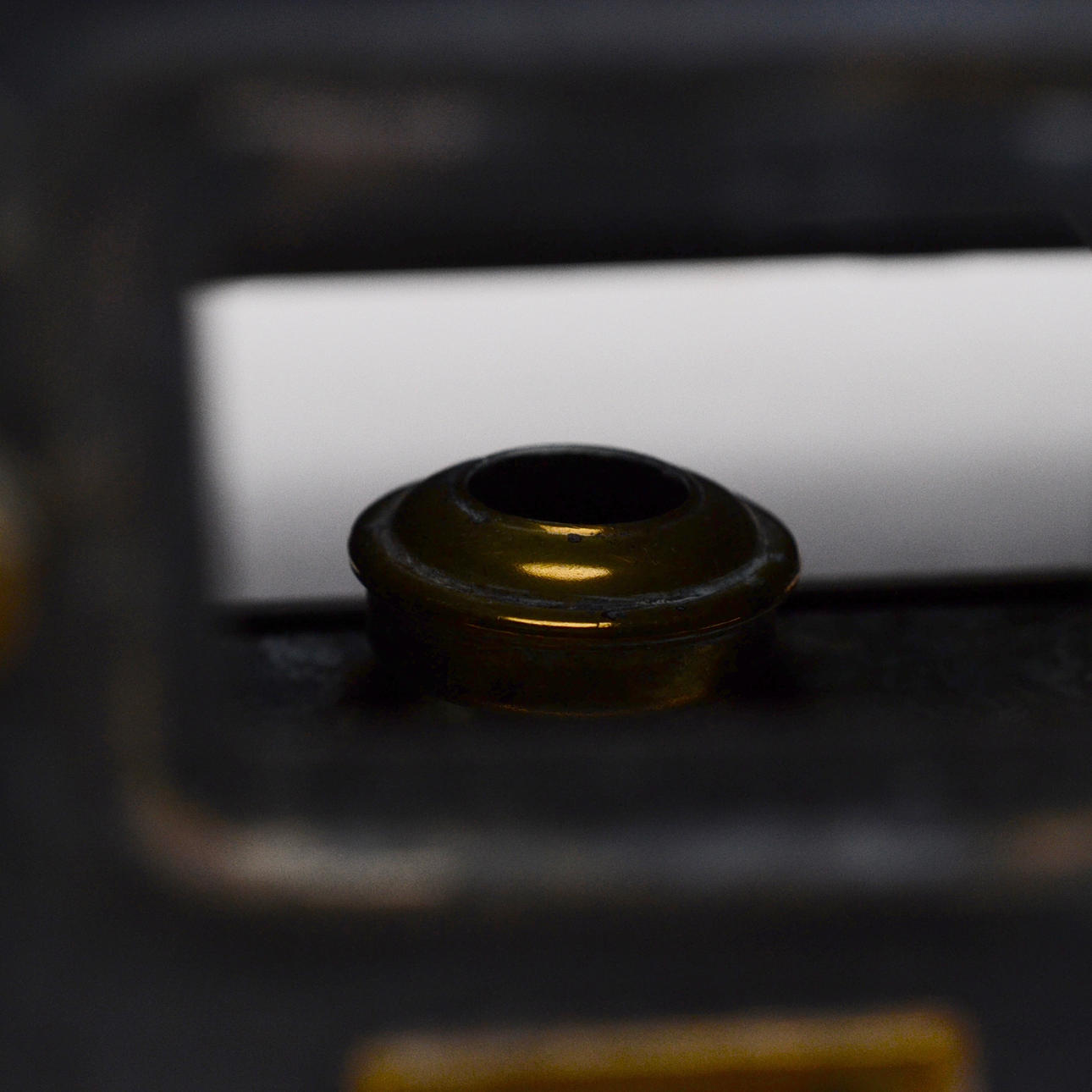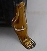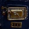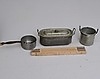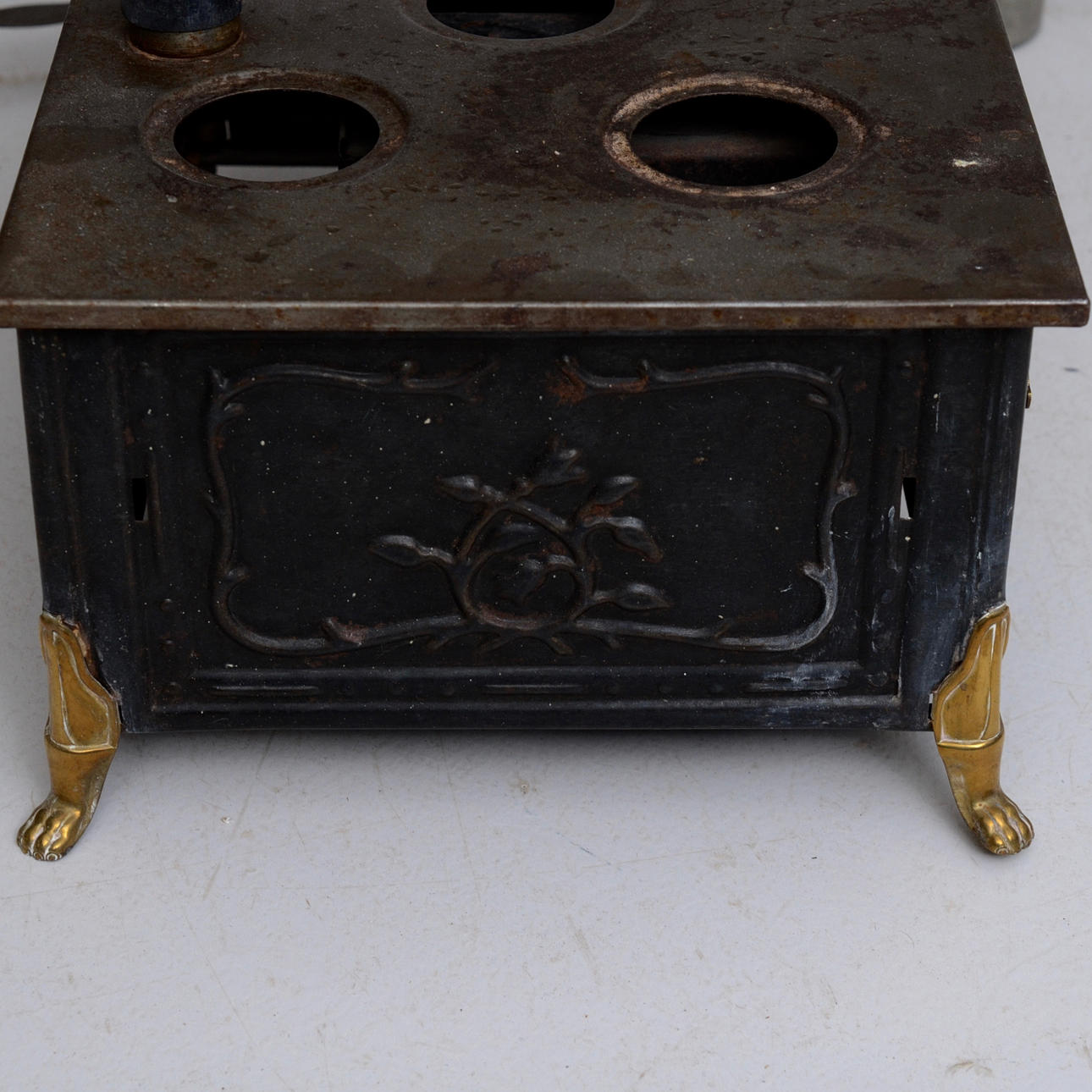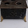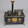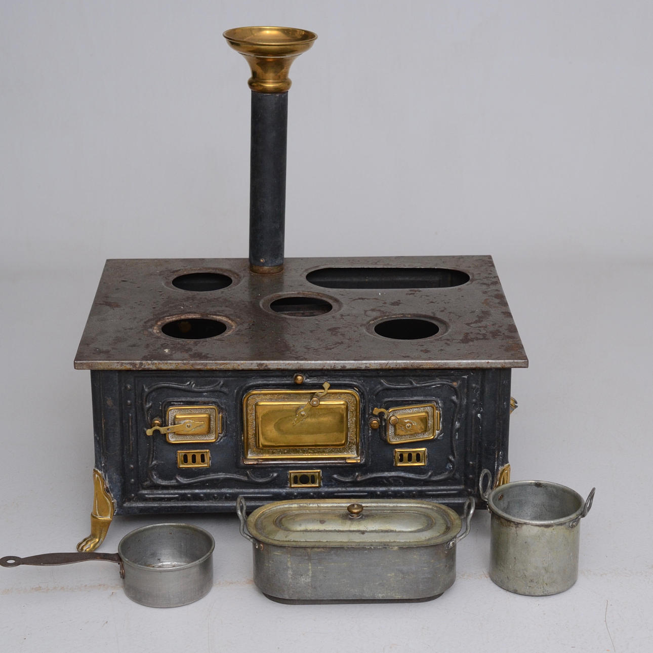Plåt med reliefdekor, ugn, fem st. plattor. Kastruller och fiskgryta. Detaljer i mässing. Spisen har brännare under plattor.
