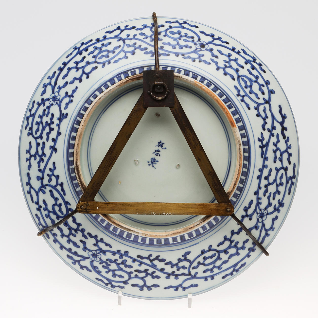 Porslin. Dekor i underglasyrblått av figurscen. Diameter 42 cm.