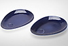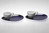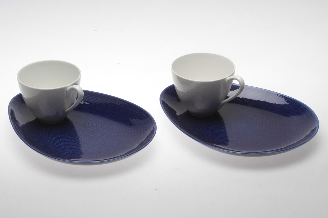 Vita kaffekoppar med blå ovala fat. Fatens längd 27,5 cm. Koppens höjd ca. 9 cm.