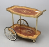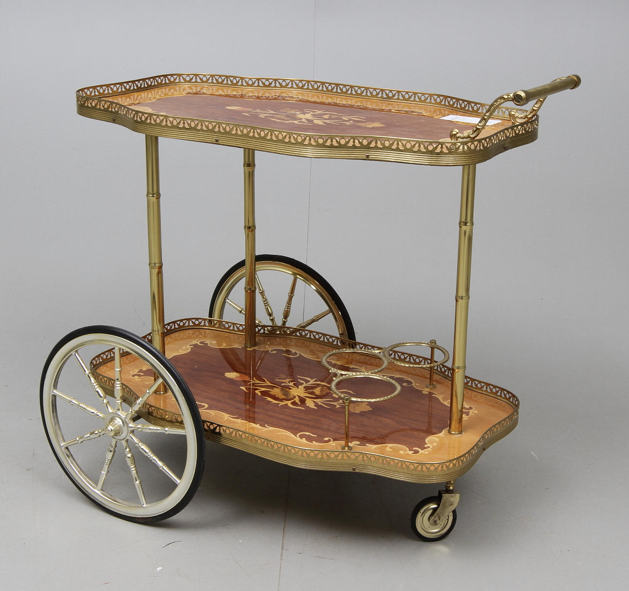 Två plan rikt dekorerade med intarsia, genombruten sarg och flaskställ i mässing, gummiklädda hjul.