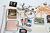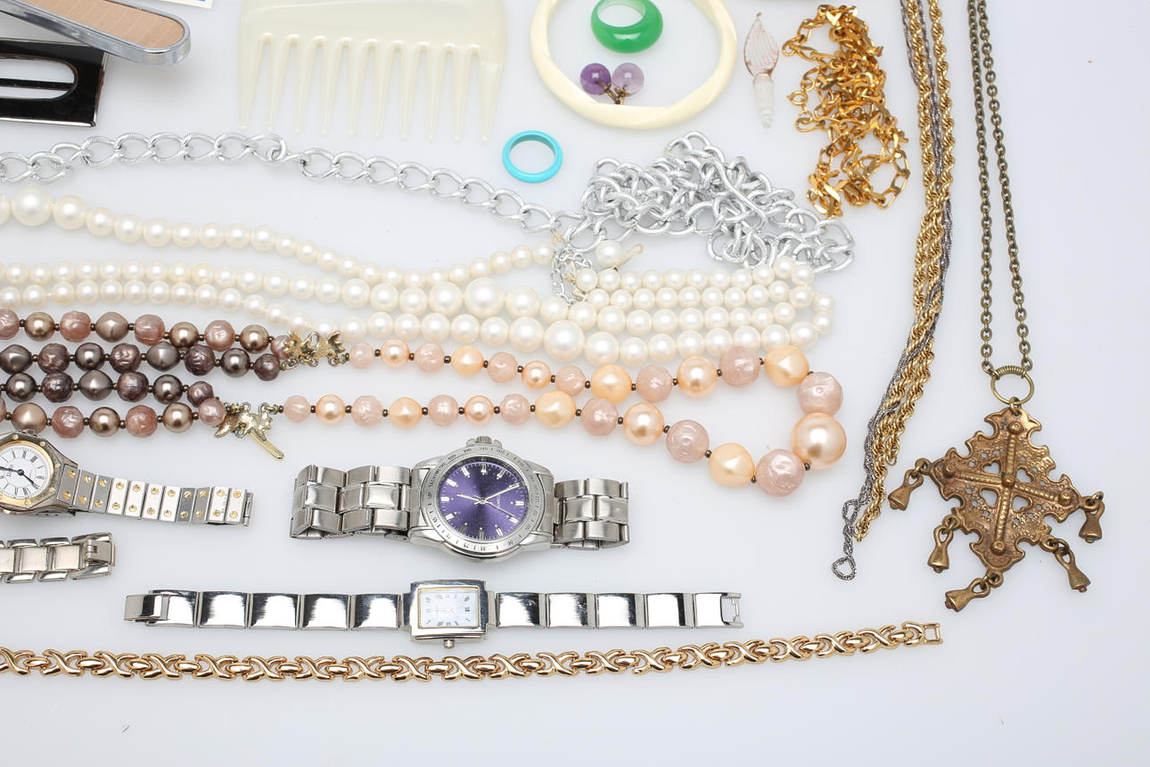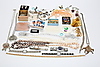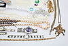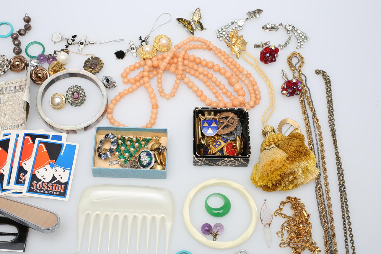Halsband, örhängen, broscher, märken, utländska mynt, handspegel m m.
