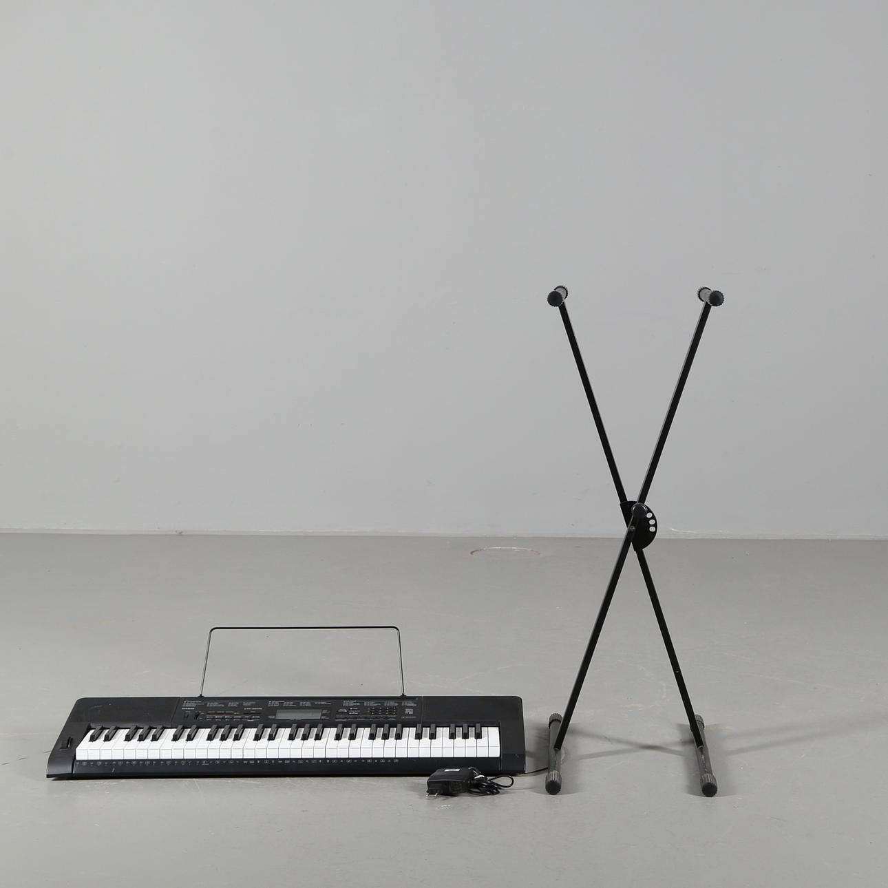 Casio CTK-3200 keyboard med strömadapter och medföljande krysstativ.