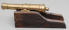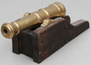 Kanon av mässing, lavett av mörkbetsad furu. Total längd 78 cm.