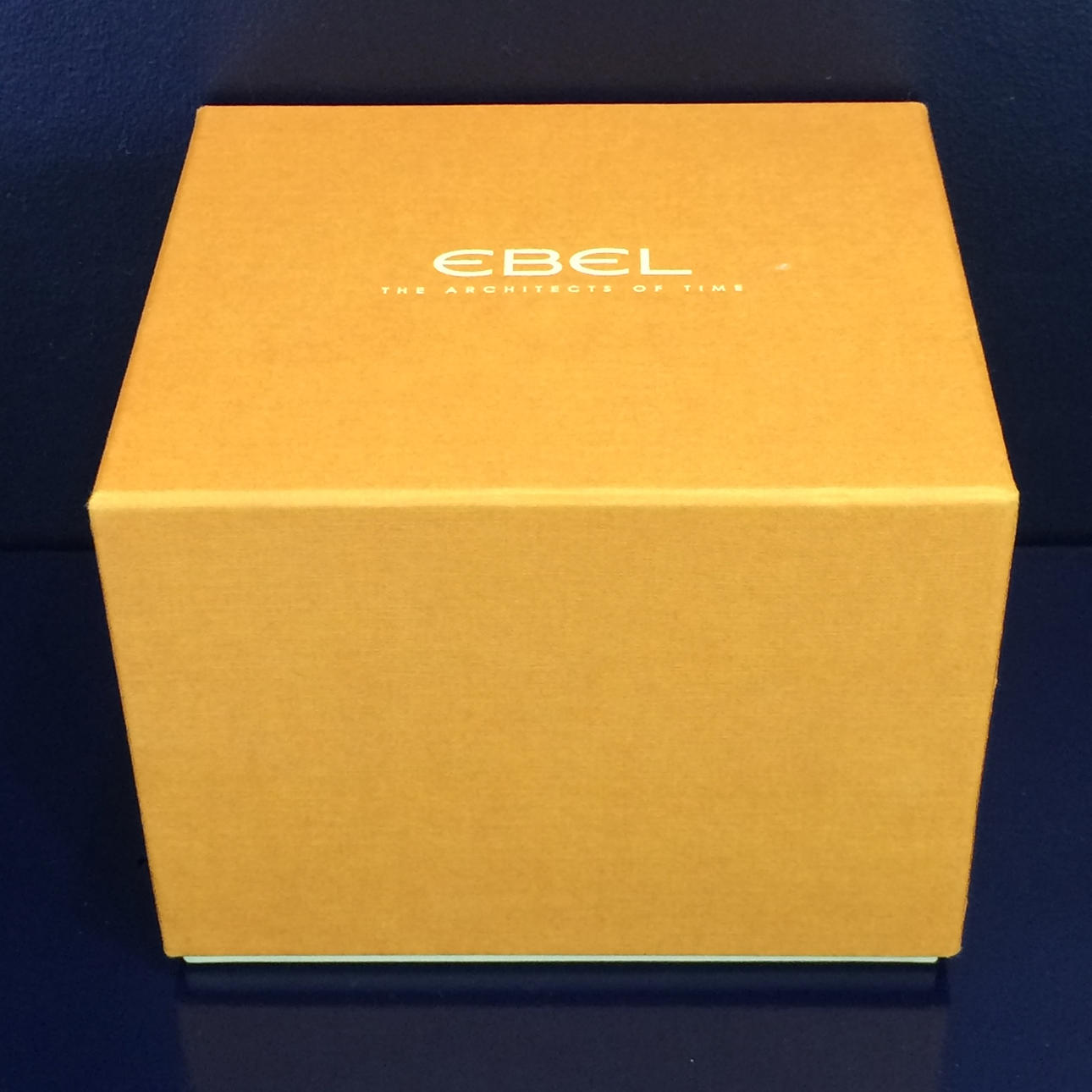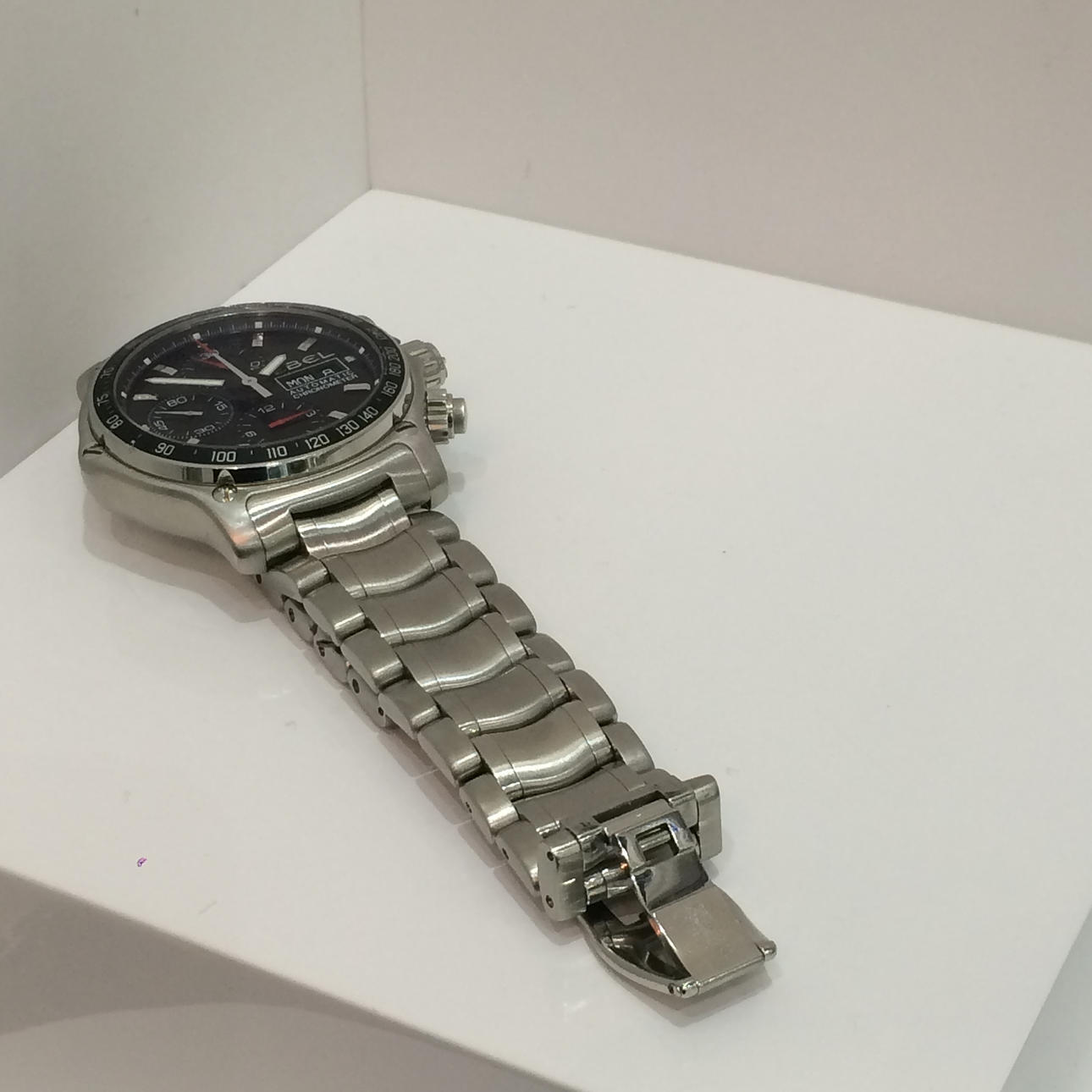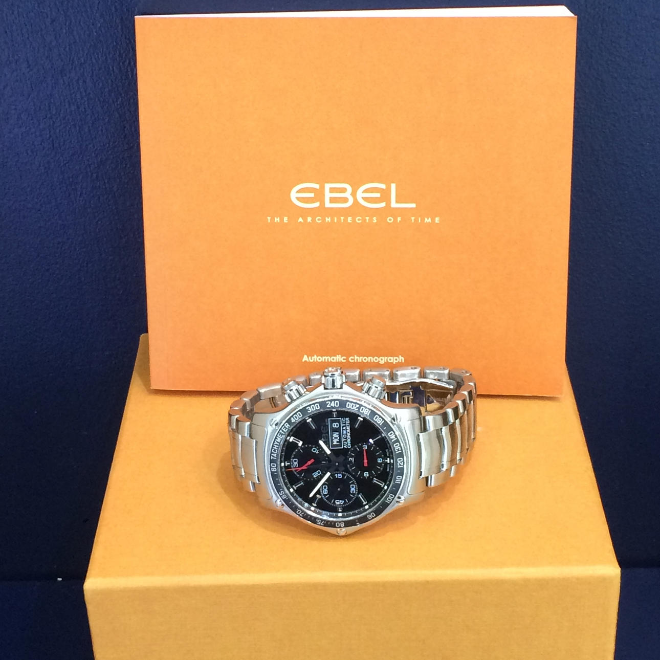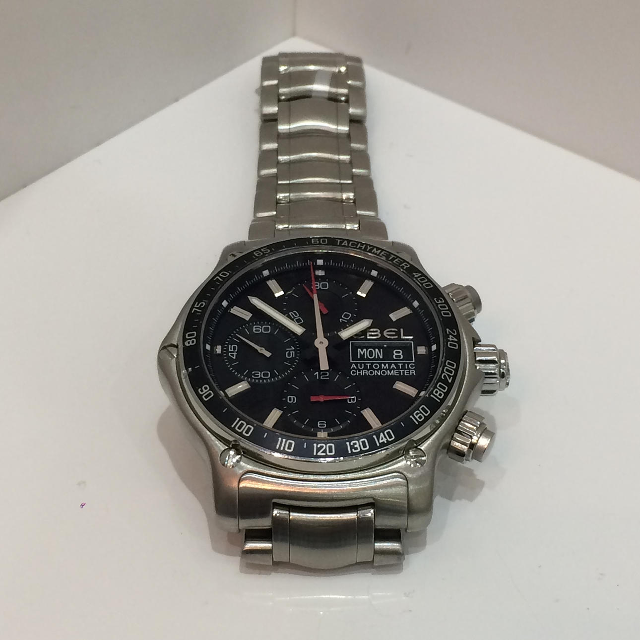 Denna Ebel-klocka har en svart urtavla och har en automatisk kronometer och ytterligare second hand.