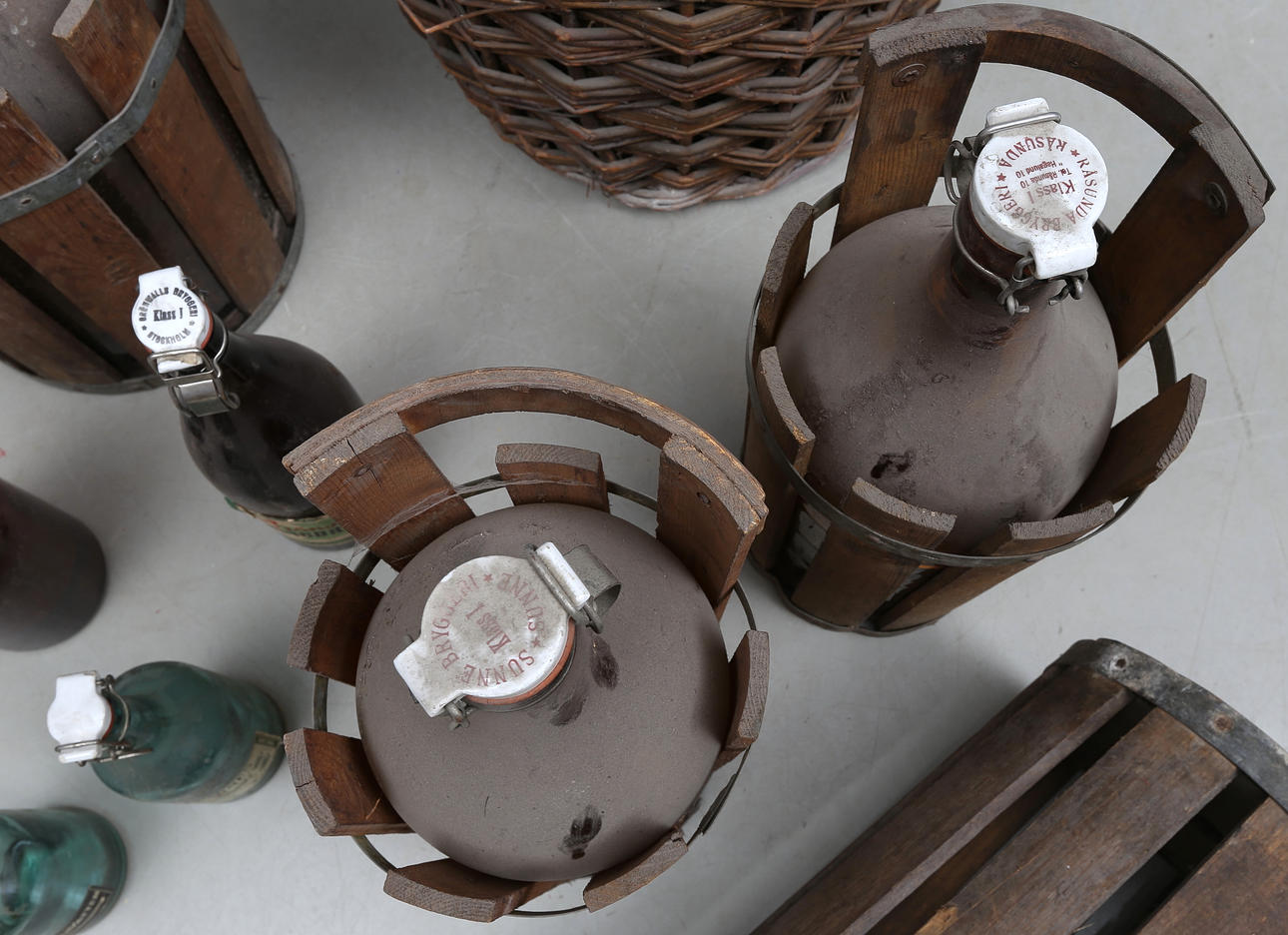 Tre flaskor med hållare av trä.