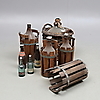 GLASFLASKOR, 8 st, samt hållare av trä, 1900-tal.