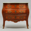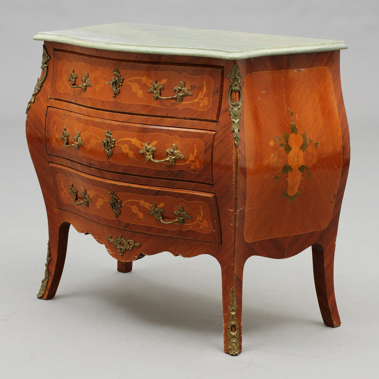 Intarsiadekor av blommor. Tre lådor. Grå stenskiva. Längd 86, bredd 45, höjd 77 cm.
