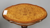 Lampbord, närmast oval rotfanerad skiva på pelarfot. Längd 57, höjd 61 cm.
