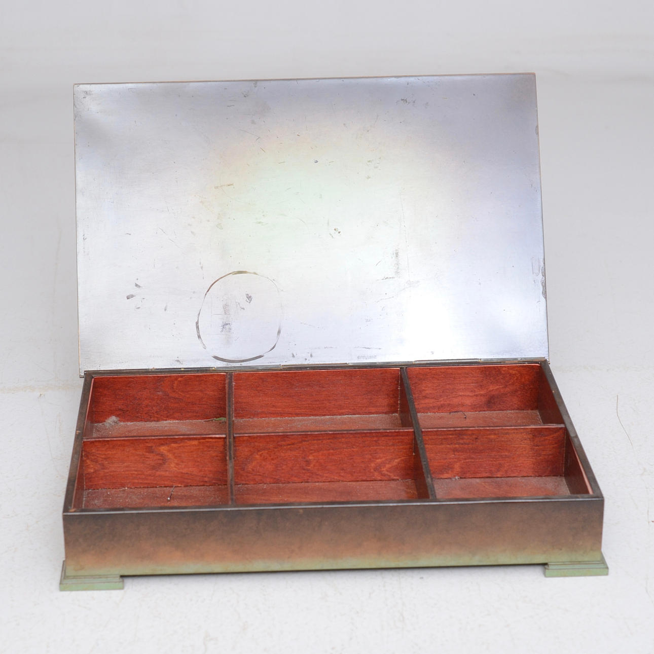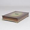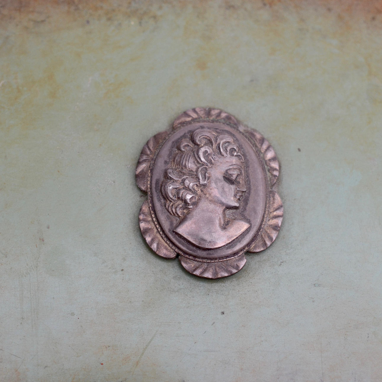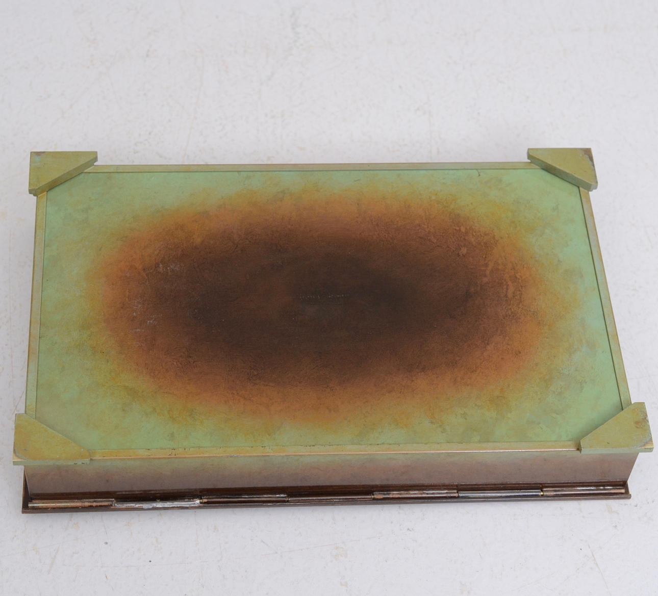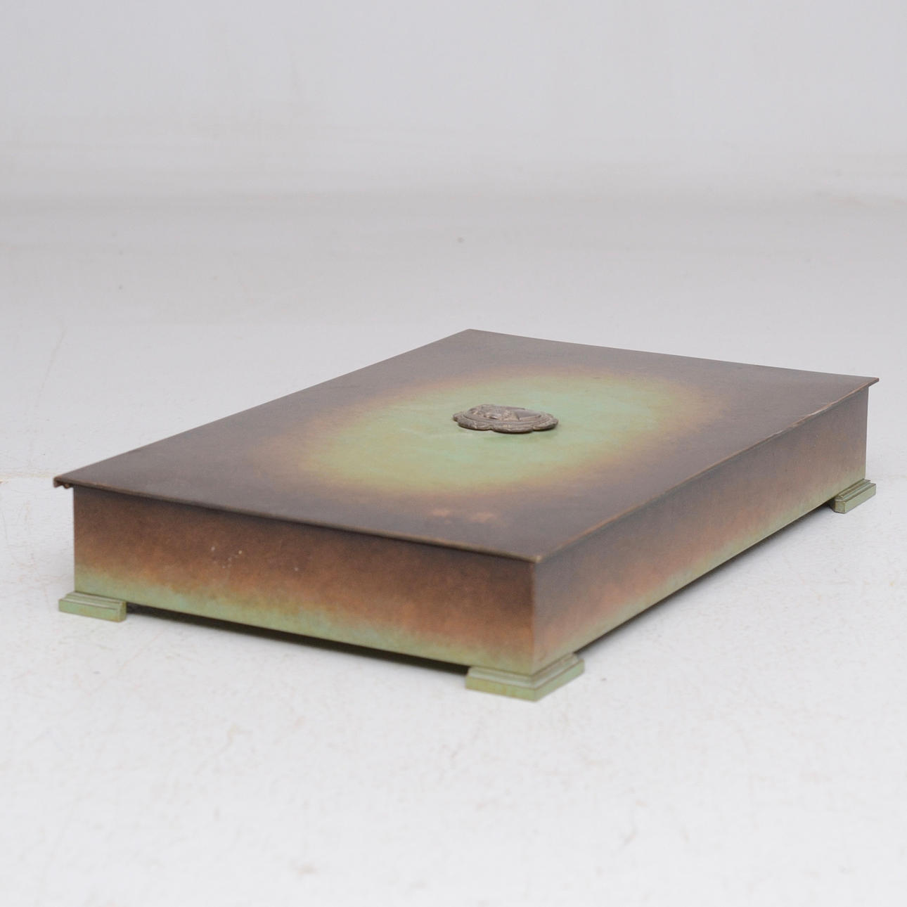 Patinerad brons, rektangulär form, dekor av kvinnoansikte.